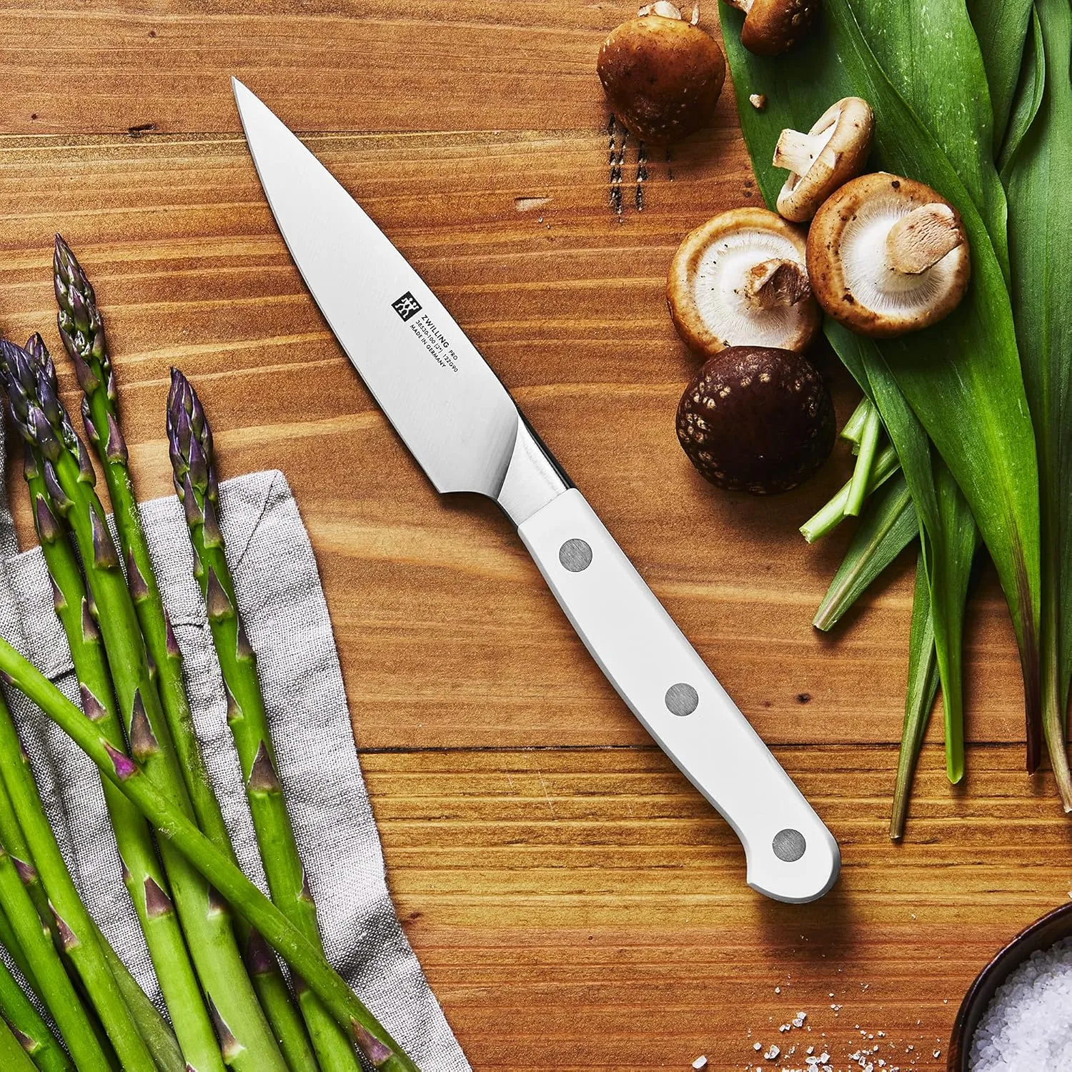10 см чистильный нож необходим для выполнения мелких задач, таких как очистка овощей, разделка фруктов и нарезка чеснока. Делайте точные и детализированные нарезки с легкостью.Zwilling Pro, самый удобный нож на рынке, теперь доступен с элегантными матовыми белыми ручками.Zwilling Pro Le Blanc обладает уникальной изогнутой подложкой, которая служит продолжением руки, поддерживая профессиональный захват, когда большой и указательный пальцы находятся на лезвии, обеспечивая безопасное резание и меньшую усталость. Лезвие разработано с широкой кривой спереди, чтобы облегчить раскатывающее движение западного резания, в то время как прямая спинка идеально подходит для азиатского рубящего движения. Полная длина лезвия может использоваться при резке и может быть заточена от подложки до кончика.