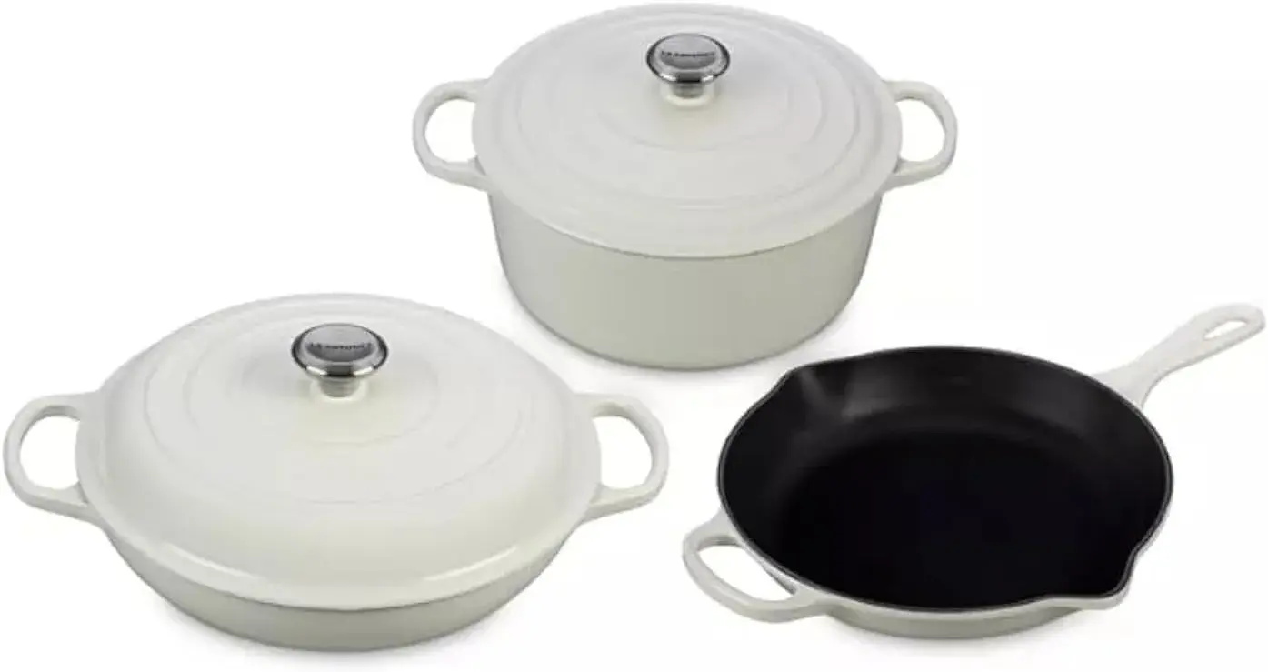Материал: чугун Цвет: белый Бренд: Le Creuset Можно мыть в посудомоечной машине: да Количество частей: 5 Включенные компоненты: кастрюля с крышкой на 6800 мл, жаровня с крышкой на 3300 мл, сковорода на 26 см Можно использовать в духовке: да Отдел: все возраста / Унисекс Включенные предметы: кастрюля объемом 7,25 литра, жаровня объемом 3,5 литра, сковорода диаметром 26 см Идеально для медленного приготовления: постоянно удерживает тепло для тушения и жарки Высокотемпературная готовка: идеально для интенсивного нагрева Эмальированные внутренние стенки: развивают естественную патину для обжаривания, sauté и жарки Легкое наблюдение: эмаль кремового цвета для четкого контроля процесса готовки Дизайн жаровни: широкое основание для обжаривания в один слой, куполообразная крышка для циркуляции пара Экономия: экономьте, покупая комплект вместо отдельных предметов Легкая очистка: можно мыть в посудомоечной машине Совместимость с духовкой: безопасно до 260°C Использование на плите: безопасно для различных плит Цветовые варианты: доступно в четырех цветах