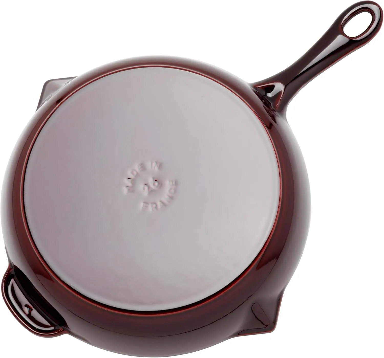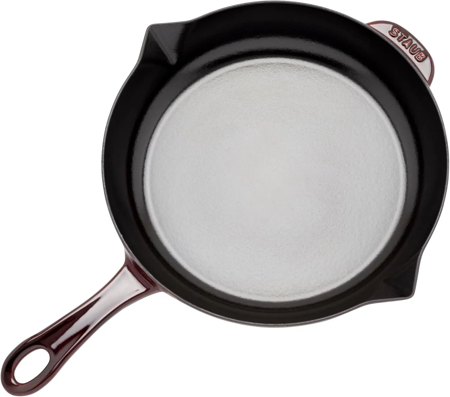 Сковороды от Staub изготавливаются из проверенного материала чугуна, который дополнительно покрывается эмалью. Поверхность прочная и легко чистится, как раз подходит для частого использования на кухне. Благодаря эффективному аккумулированию тепла обжаривание работает так же хорошо, как и медленное, стабильное приготовление. Прежде всего, равномерное выделение тепла обеспечивает бережное и здоровое приготовление пищи. Таким образом, ароматы и питательные вещества сохраняются особенно хорошо. Сковорода имеет диаметр 26 см. Она имеет чугунную ручку, поэтому сковороду можно использовать не только на любой плите, но и в духовке. Два носика используются для отвода лишнего жира или для расстановки соусов. Чугун имеет матовую черную эмаль, которая обладает вкусовыми свойствами. Они даже усиливаются при частом использовании. Поверхность сковороды-гриль прочная и чрезвычайно проста в уходе. Благодаря хорошему удержанию тепла чугуном пища остается теплой в течение длительного времени, так что вы можете легко подать ее в со вкусом оформленной сковороде на обеденном столе. Сковорода подходит для использования на всех типах плит, в том числе и на индукционных. Вы также можете без лишних слов поставить противень в духовку, например, аккуратно продолжить приготовление ранее обжаренного мяса. С помощью сковороды от Staub вы можете создавать вкусные блюда для жарки и вкусные соусы, которыми можно побаловать своих гостей.