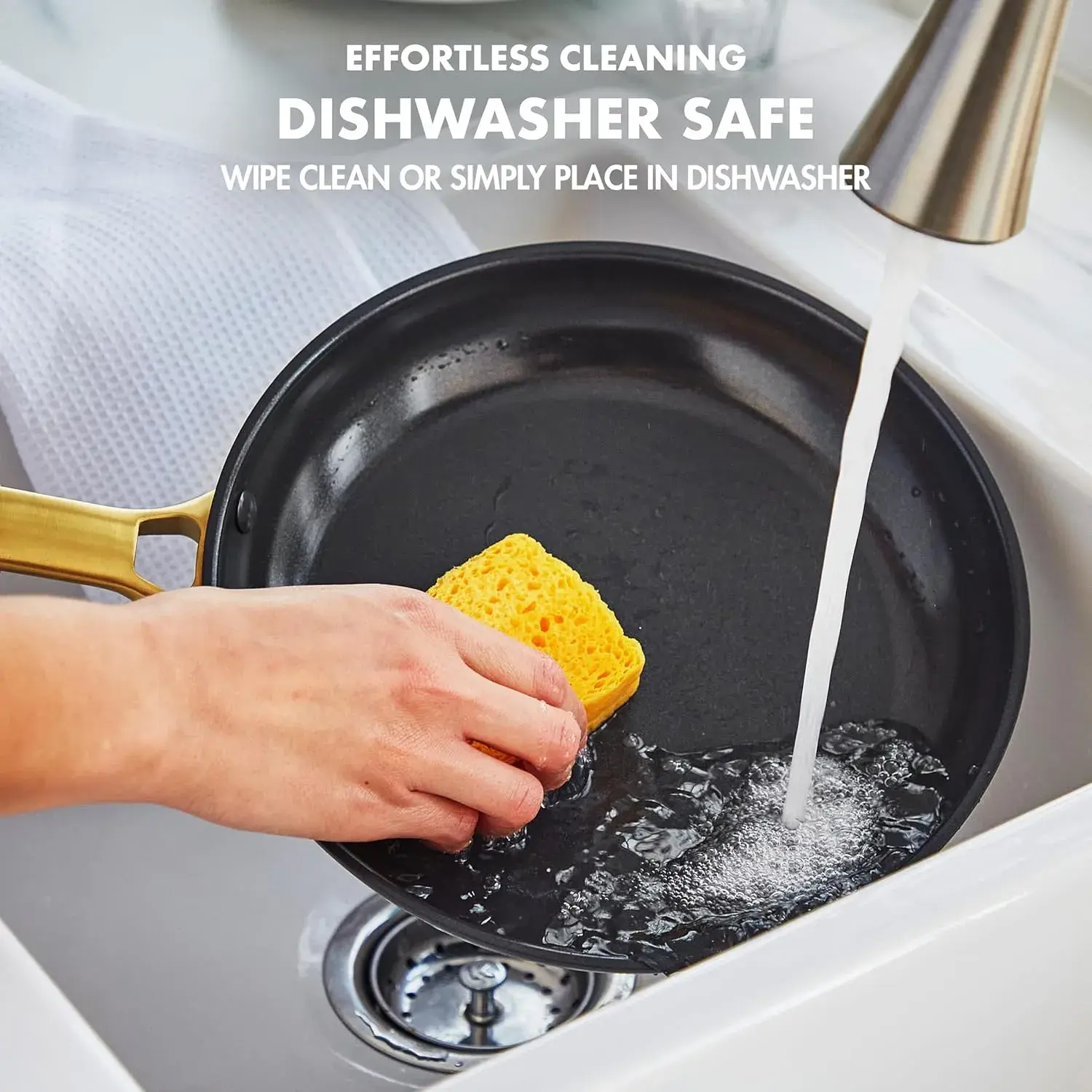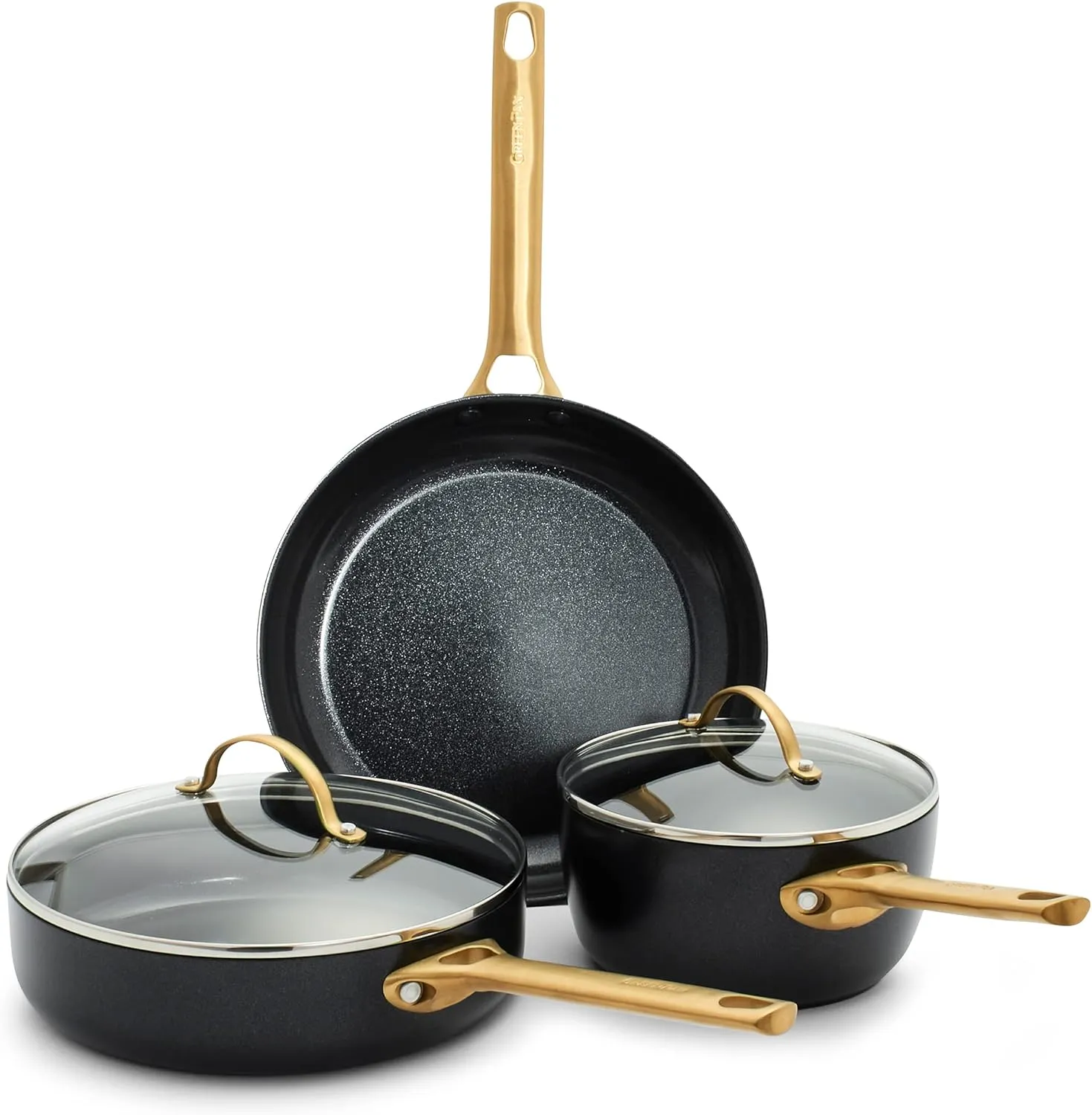 Технологии мирового класса встречаются с минималистичным стилем в ограниченной серии коллекции GreenPan. Изготовленный из жесткого анодированного алюминия для равномерного распределения тепла и устойчивости к царапинам, этот набор из 5 предметов отличается эффектными матовыми ручками с золотой отделкой.