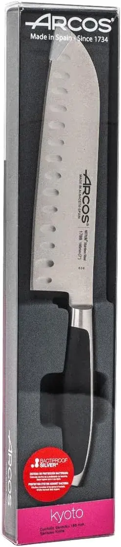 Представляем нож Santoku серии Arcos Kyoto, идеальное дополнение к любой кухне. Этот нож обладает эксклюзивным дизайном с минималистичными линиями, превосходной прочностью и двусторонней заточкой. Серия Kyoto изготовлена из единого куска закаленной высококачественной стали, известной как NITRUM, что делает ее невероятно прочной и долговечной. Рукоятка этого ножа разработана для оптимального комфорта и прочности. Она изготовлена из полиоксиметилена (POM), материала высшего качества, который устойчив к моющим средствам, износу и экстремальным температурам (от -40ºC до 150ºC). Новаторский дизайн и контрастный черный цвет рукоятки придают этому ножу нотку класса и элегантности. Нож Santoku серии Arcos Kyoto идеально подходит для нарезки, шинковки и рубки.Его лезвие длиной 18 см изготовлено из нержавеющей стали, что гарантирует его прочность и остроту для выполнения любых задач. Двусторонняя заточка лезвия позволяет легко нарезать даже самые жесткие продукты, в то время как его.. Эргономичный дизайн обеспечивает комфортное использование в течение длительного времени. Этот нож поставляется в футляре, что делает его идеальным подарком для любого домашнего повара или профессионального шеф-повара. Нож Santoku из серий Аркос Кио - это необходимый инструмент для тех, кто ценит качество, долговечность и стиль в кухонных принадлежностях. Вкратце, нож Santoku из серий Аркос Кио является высококачественным кухонным инструментом, который предлагает превосходную прочность, долговечность и стиль.Его эргономичный дизайн, двусторонняя заточка и высококачественные материалы делают его идеальным дополнением любой кухни. Закажите свой сегодня и ощутите разницу сами!