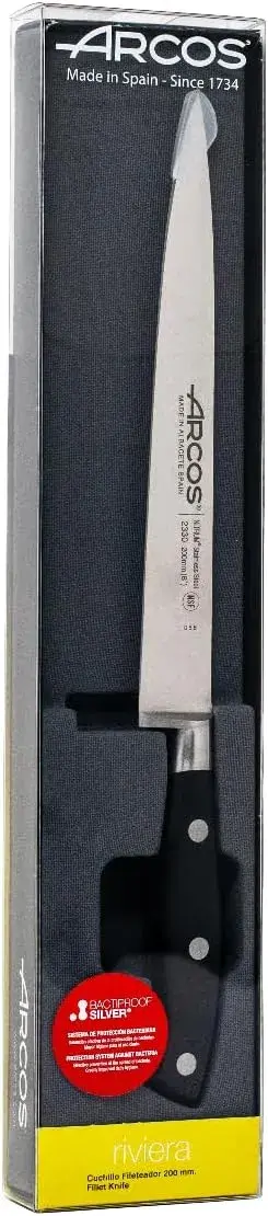 Нож для филе серии Ривьера длиной 200 мм, разработанный компанией Arcos, дарит вам ощущение удовлетворения при нарезке мяса благодаря своему остро заточенному лезвию. Ножи для филе из серии Ривьера имеют длительный срок службы при правильном использовании. Этот нож ускорит вашу работу на кухне, так как позволяет удобно и быстро филе мяса и рыбы. Он легкий и удобный в использовании.
