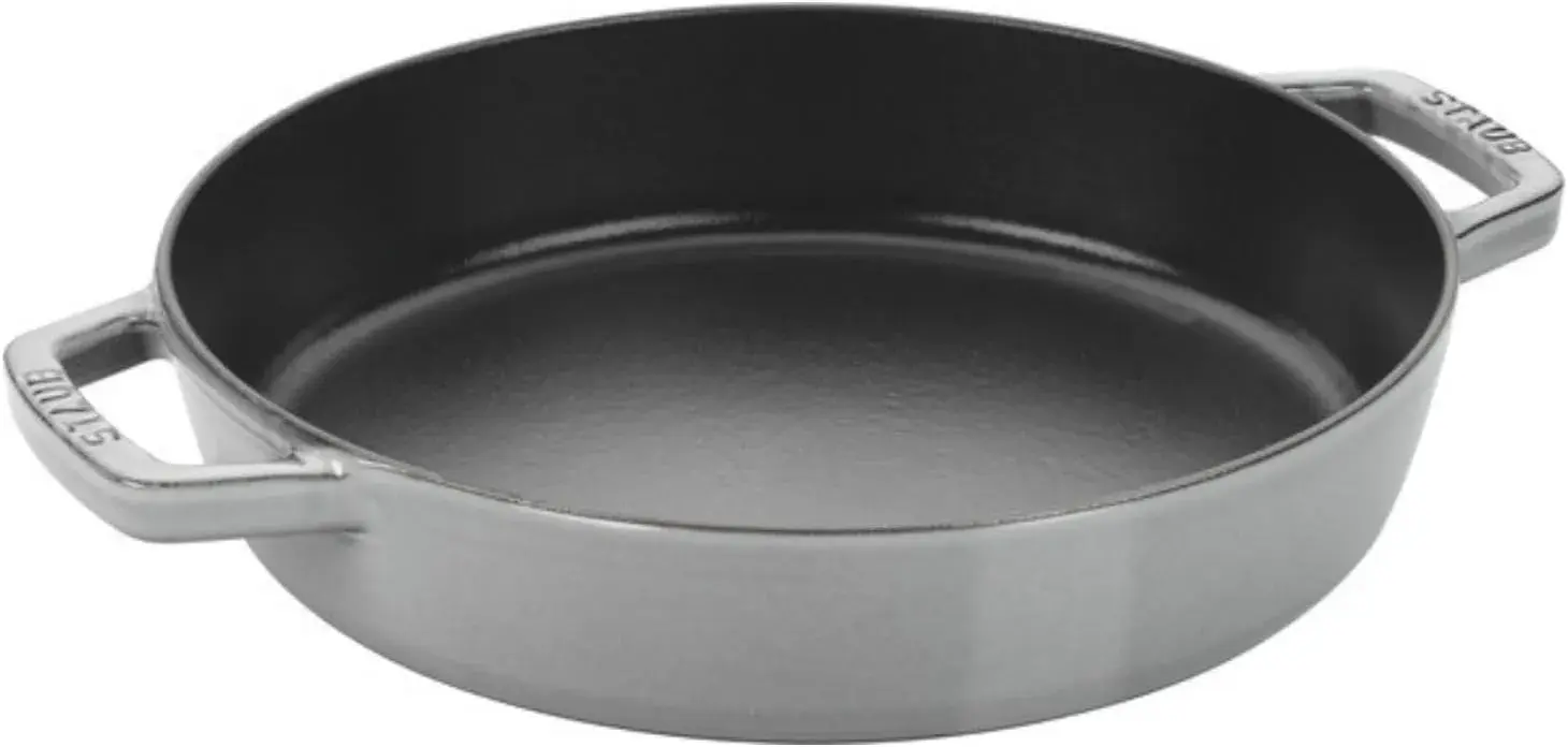 Вы хотите полного контроля над своими действиями на кухне? Staub удовлетворит ваши потребности с помощью сковороды с двумя ручками. Уверенность в каждом движении еще никогда не была так велика. Сосуд изготовлен из чугуна и в полной мере использует его тепловые свойства. При жарке температура сначала впитывается и через некоторое время равномерно распределяется по всей поверхности блюда. Несмотря на прочную конструкцию, кастрюля весит всего 5 кг, а ее глубина составляет около 5 см. Его можно без проблем использовать для приготовления мясных, рыбных или овощных блюд. Стильный дизайн также позволяет использовать его в качестве сервировочной тарелки. Комфорт и удобство – одна из самых важных вещей в деятельности любого шеф-повара, будь то любитель или профессионал. А если одной ручки недостаточно, на помощь приходит пыль. ОСОБЕННОСТИ Две металлические ручки обеспечивают комфорт и высокую простоту использования. Покрытие равномерно распределяет тепло. Сковороду можно мыть как под проточной водой, так и в посудомоечной машине. Подходит для использования на газовых, электрических и индукционных плитах.
