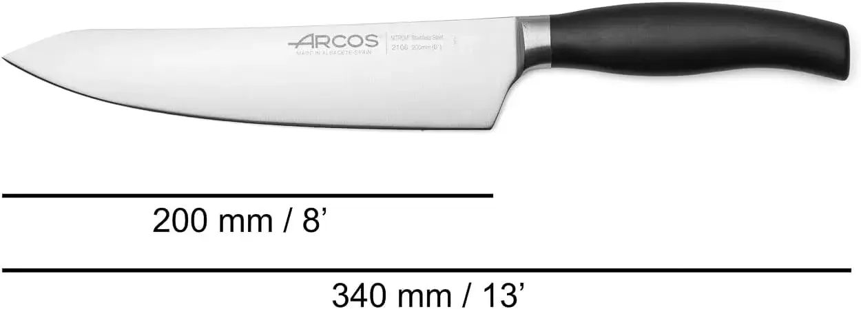 Представляем нож шеф-повара Arcos Serie Clara, идеальный инструмент для лучших поваров мира. С его заточенным лезвием из нержавеющей стали NITRUM длиной 200 мм 20 см и черной ручкой из инжектированного полипропилена, этот нож предназначен для того, чтобы сделать ваш кулинарный опыт легким и приятным.Serie Clara от Arcos - это уникальное сочетание нашего самого утонченного лезвия и самой простой ручки. В результате получается нож, который обеспечивает исключительную производительность и комфорт. Будь вы профессиональный шеф-повар или домохозяйка, этот нож поможет вам с легкостью готовить самые вкусные блюда. Мы гордимся нашей упаковкой, которая заботится о планете. Наша серия Clara представлена в 100% перерабатываемой упаковке и с картоном, сертифицированным PEFC, производимым из хорошо управляемых лесов. Мы хотим сократить наши потери с помощью одноразовых материалов и оставить положительное воздействие на окружающую среду.Arcos Hermanos - ведущая компания по производству ножей, работающая в 94 странах мира. Наши ножи известны своим качеством и успехом. И мы хотим оставить свой след в мире. С человеческой командой из около 500 человек мы производим 1,100 различных моделей ножей и в среднем 75,000 единиц в день.