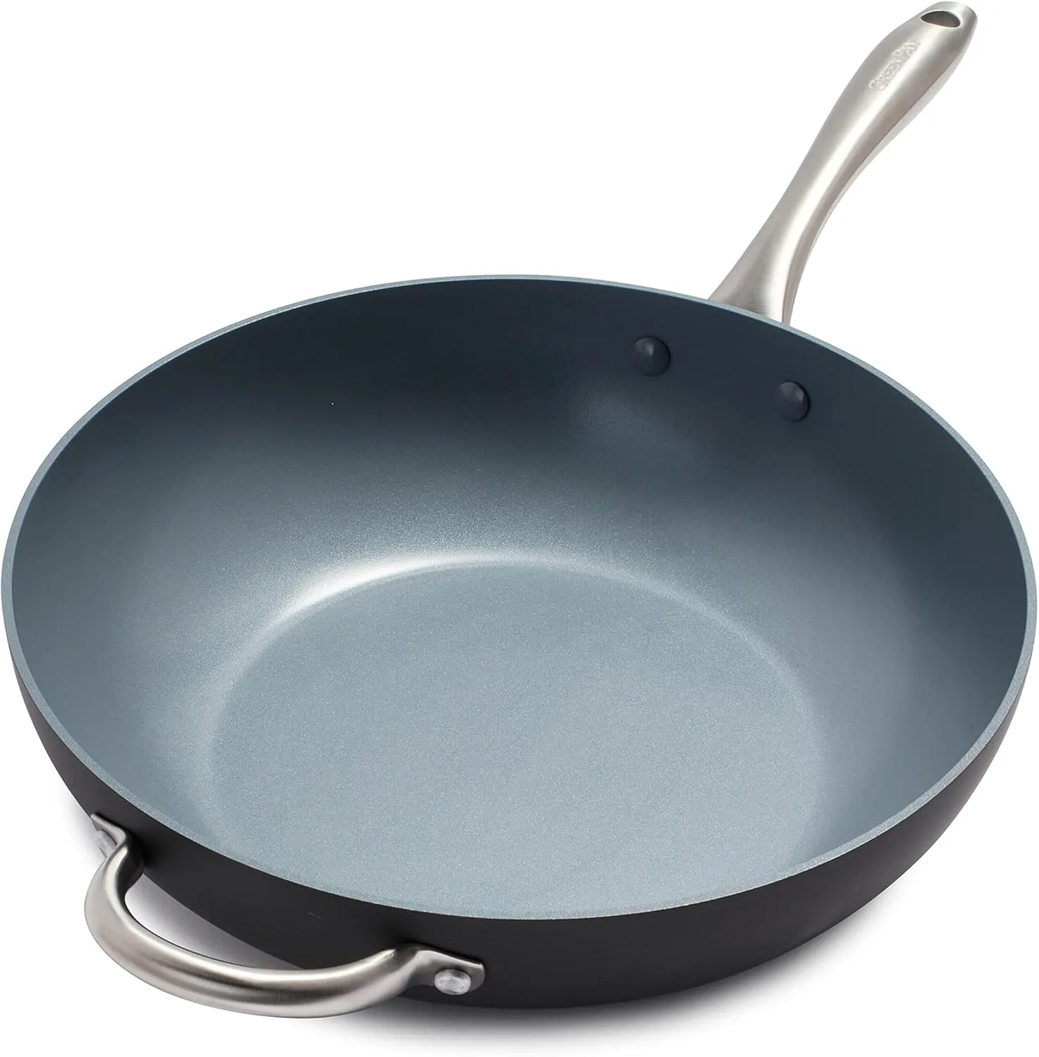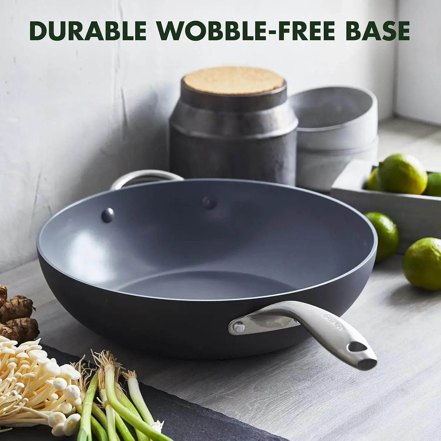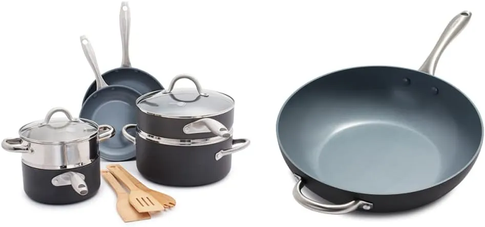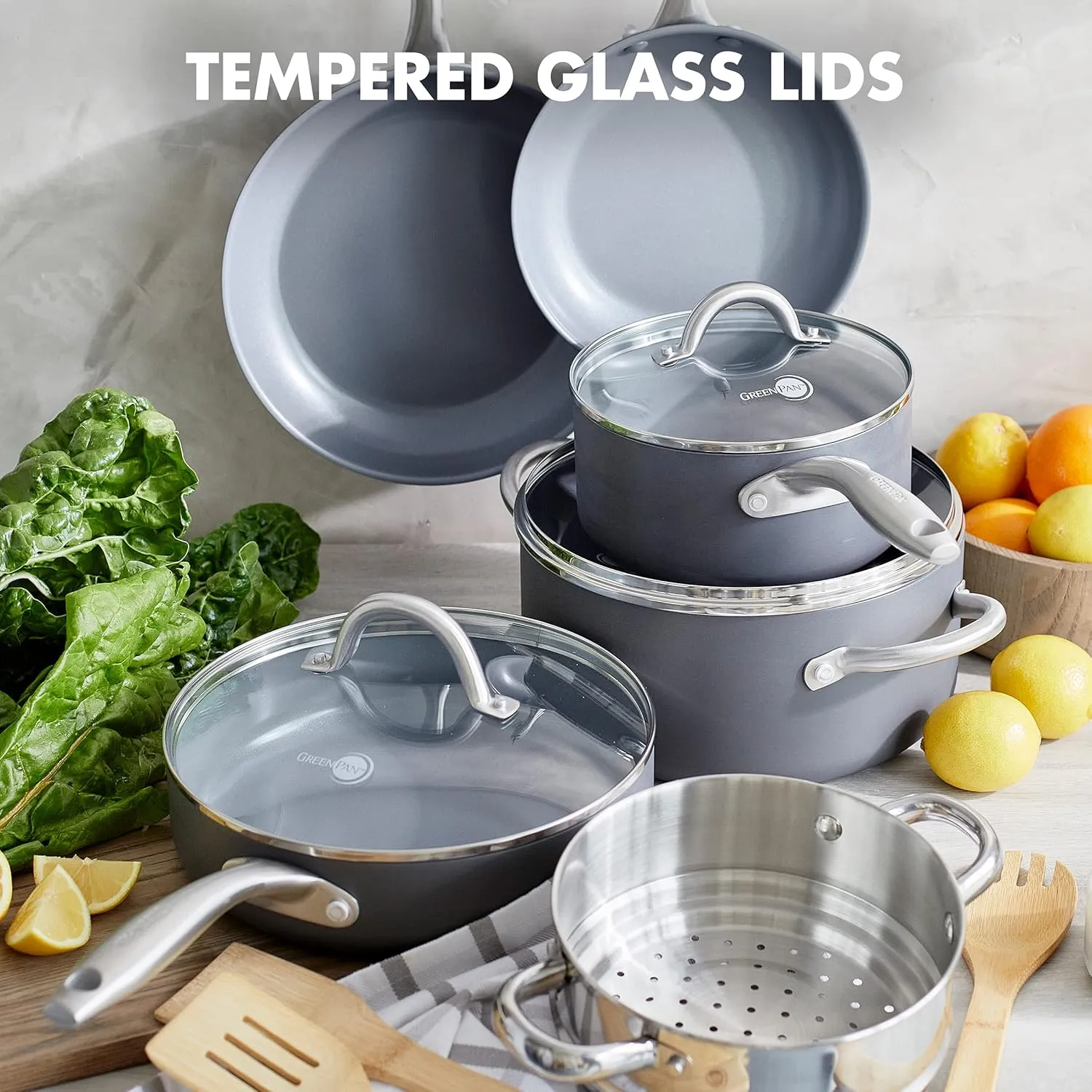 GreenPan Lima Здоровая керамическая антипригарная посуда, набор кастрюль и сковородок, 12 предметов, серый. Коллекция GreenPan Lima имеет все для удовлетворения даже самых требовательных поваров. Классический набор из 12 предметов керамической антипригарной посуды изготовлен из жесткого анодированного алюминия, легко использовать, а современная ручка из нержавеющей стали придает элегантный акцент. Независимо от того, используете ли вы коллекцию Lima в духовке или на плите, керамическое антипригарное покрытие Thermolon останется нетронутым и обеспечит профессиональные результаты. Этот предмет также легкий и имеет стеклянную крышку, чтобы можно было контролировать вашу еду во время готовки. Сделайте правильный выбор, выберите Lima. Края без капель для легкого наливания.