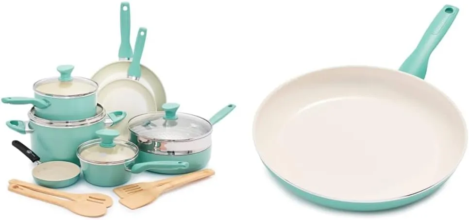 Комплект посуды GreenPan Rio Healthy Ceramic Nonstick из 16 предметов, без PFAS, подходит для мытья в посудомоечной машине, бирюзовый. Добавьте яркий цвет в вашу кухню с ярким стилем коллекции GreenPan Rio. Этот 16-прядный набор посуды включает в себя все кастрюли и сковороды, которые вам нужны для более чистого приготовления пищи. Почему? Каждая из этих кастрюль и сковород имеет наше здоровое керамическое антипригарное покрытие Thermolon - легкое в освобождении и чистке покрытие, свободное от PFAS, PFOA, свинца и кадмия для беззаботного приготовления. В отличие от многих других антипригарных покрытий, оно никогда не выделяет токсичные пары, даже если перегревается. Это прочное покрытие усилено алмазами, чтобы обеспечить долговременное превосходное антипригарное качество. Прочная конструкция набора обеспечивает равномерное распределение тепла, в то время как ручки из бакелита остаются холодными на ощупь и обеспечивают удобный хват и полный контроль. Прочные стеклянные крышки позволяют видеть процесс приготовления пищи, не теряя при этом тепло. Подходит для мытья в посудомоечной машине