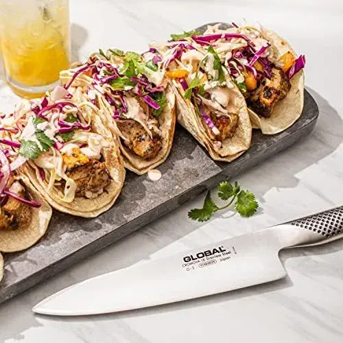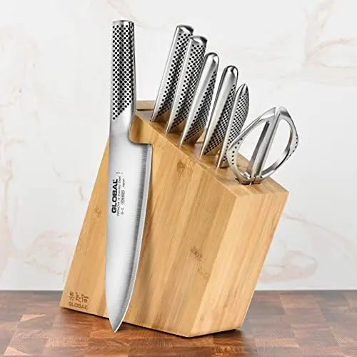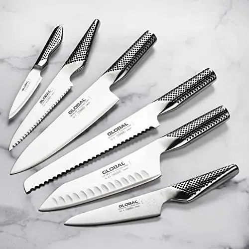 Глобальные ножи содержат два инновационных аспекта: лезвие и балансировку. Самая важная деталь любого ножа - это его лезвие, и лезвие Global является его настоящим знаком отличия. Ножи Global заточены под острым углом и имеют крутой профиль, при этом устойчивы к ржавчине, пятнам и коррозии. Прямое лезвие позволяет получить значительно более острый нож, который дольше остается острым. Лезвие ножа Global настолько велико и заметно, что его легко увидеть невооруженным глазом, и оно выступает на четверть дюйма или более от кончика ножа. С момента своего скромного начала Global превратился в один из самых успешных брендов профессиональных кухонных ножей в мире.