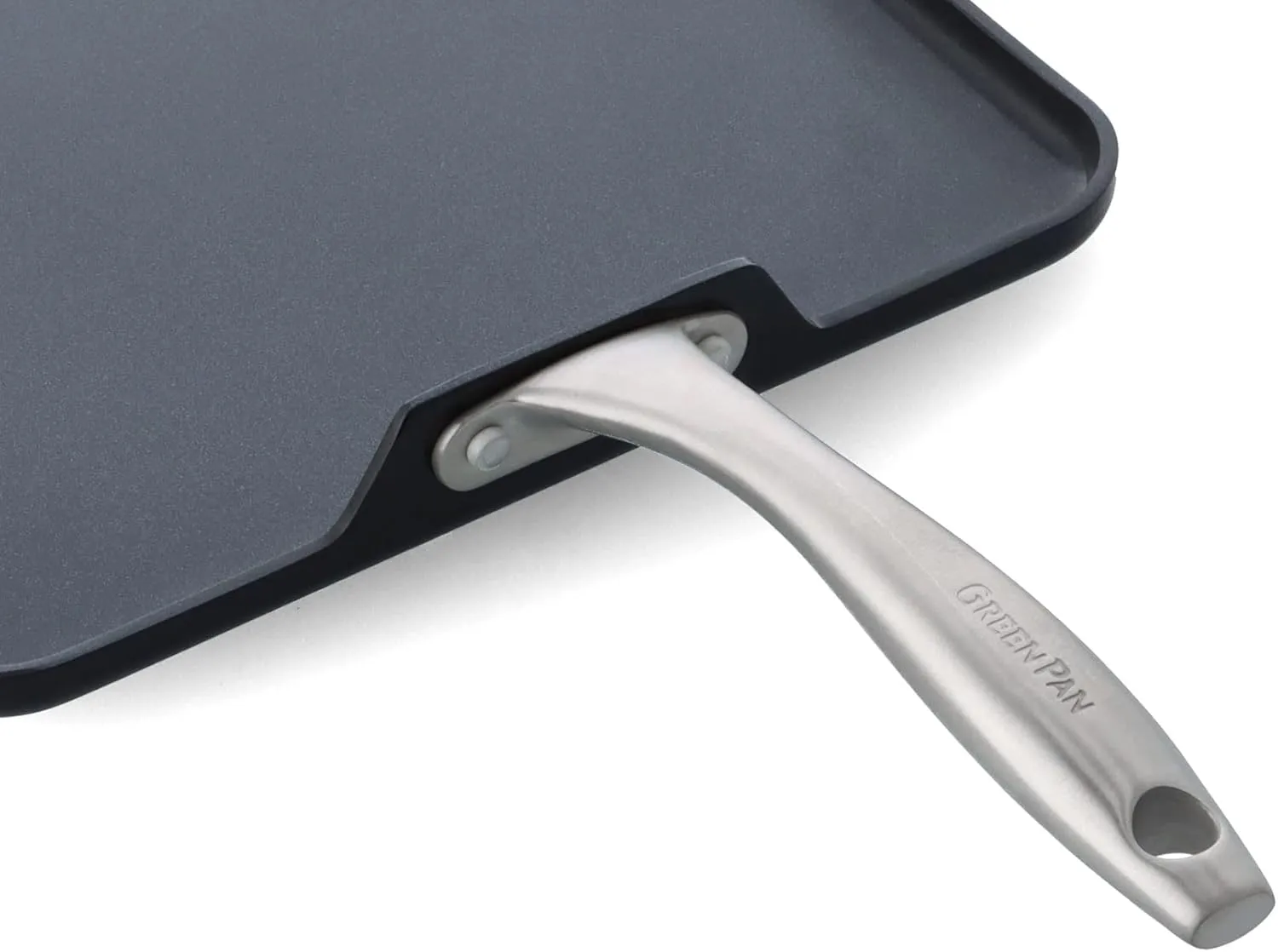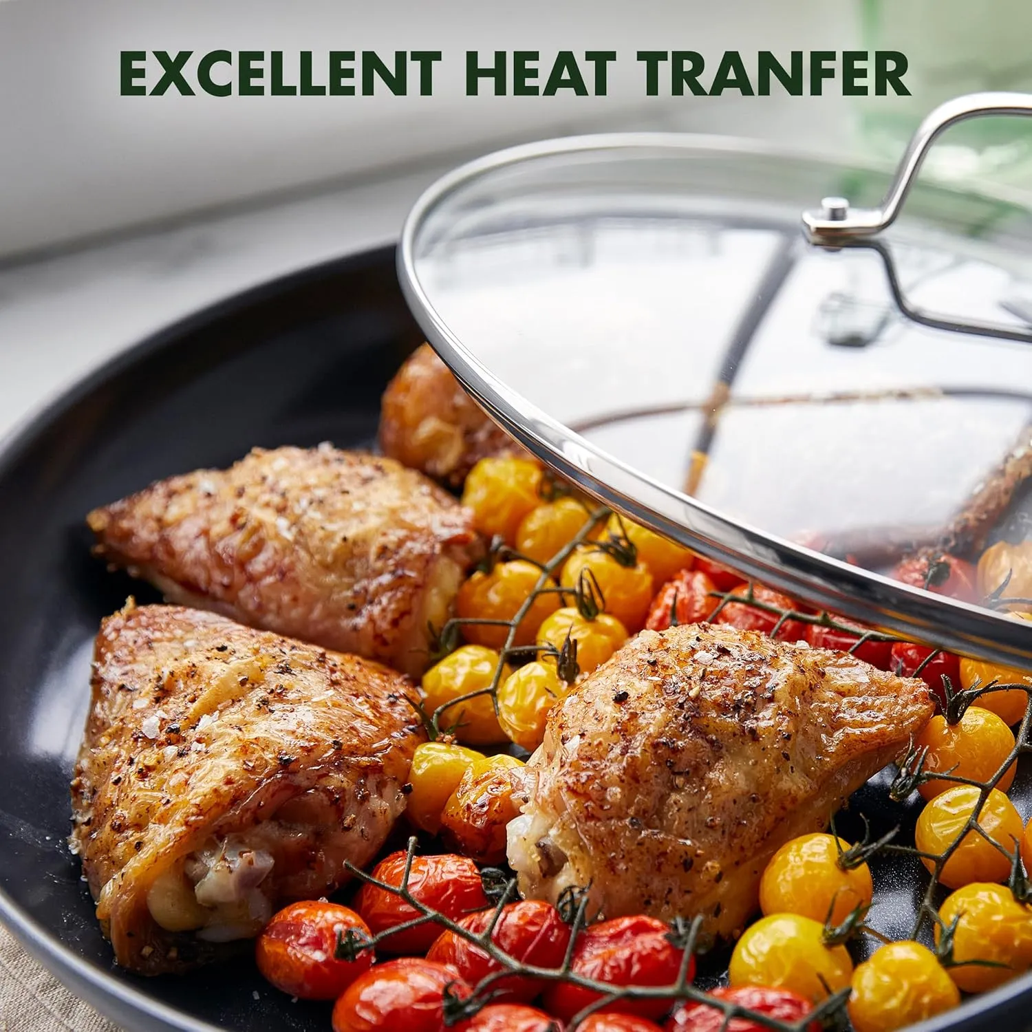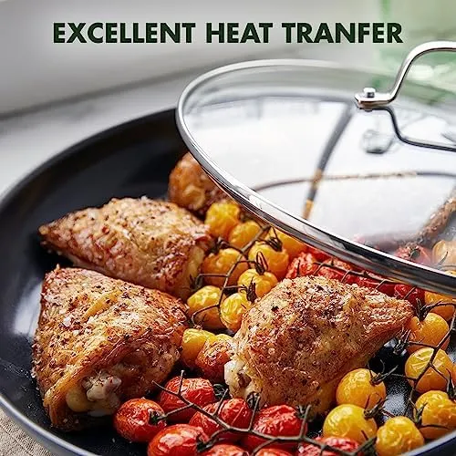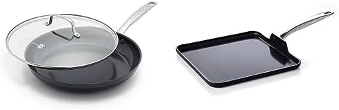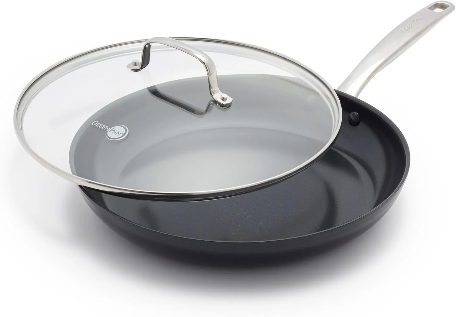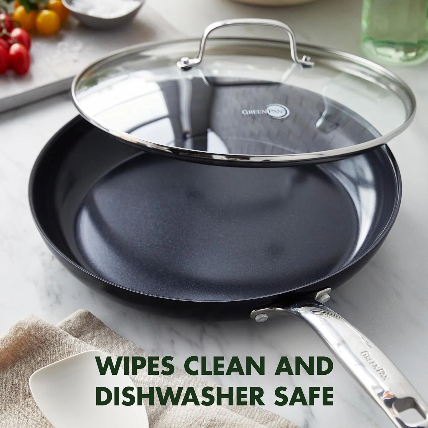 GreenPan Chatham Black Prime Midnight анодированный здоровый керамический антипригарный сковорода с крышкой, без PFAS, можно мыть в посудомоечной машине, безопасен для использования в духовке, черный ЭКСКЛЮЗИВ! Коллекция Chatham Black Prime Midnight объединяет идеальную функцию и стиль. Эта сковорода изготовлена из прочного анодированного алюминия для максимальной прочности и защиты от царапин. Антипригарное покрытие Thermolon на основе здоровой керамики безопасно для металлических принадлежностей и усилено алмазами для дополнительной прочности и легкости в использовании. Изготовлено без PFAS, PFOA, свинца или кадмия, наше антипригарное покрытие никогда не выделяет токсичных паров, даже если оно случайно перегревается, так что вы можете сосредоточиться на готовке. Края без капель позволяют легко наливать, а полированная нержавеющая сталь ручка обеспечивает надежный захват. Можно мыть в посудомоечной машине. Безопасен для использования в духовке до 600°F.