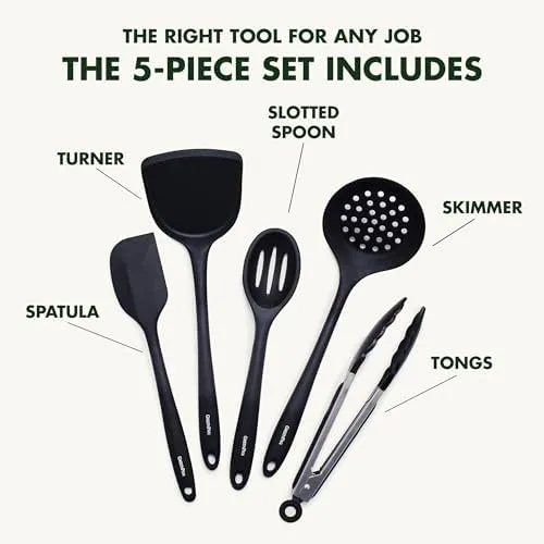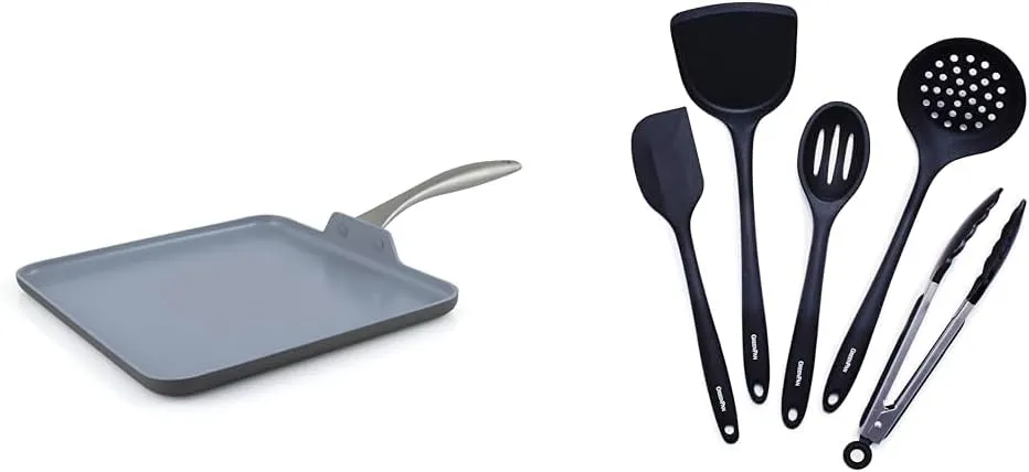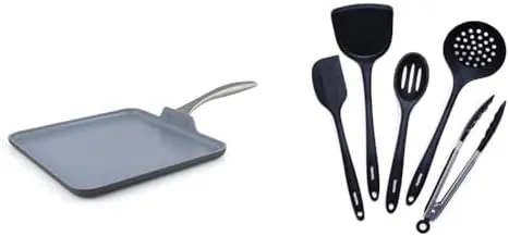 Этот комплект из 11 предметов посуды и принадлежностей GreenPan идеально подходит для обновления ваших кухонных инструментов. В комплект входит квадратная керамическая сковорода GreenPan Lima диаметром 28 см, а также набор из 5 силиконовых кухонных принадлежностей GreenPan. Сковорода GreenPan изготовлена с использованием здорового керамического антипригарного покрытия Thermolon, свободного от PFOA, PFAS и токсинов. Это делает ее безопасной для повседневного приготовления пищи. Тело сковороды из жесткого анодированного алюминия делает ее легкой, но в то же время прочной. Она может выдерживать температуру в духовке до 600°F. Квадратная форма сковороды и просторная поверхность для готовки делают ее удобной для приготовления яиц, блинов, бекона и многого другого для всей семьи.