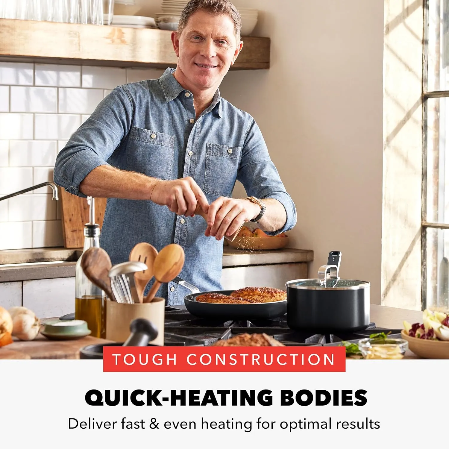 Мировоизвестный шеф-повар, телеведущий, ресторатор и автор Бобби Флей объединился с GreenPan, чтобы привнести многолетний опыт и инновации в кулинарии в эту современную коллекцию. Изготовленные из быстрозавревающего алюминия, эти сковороды позволяют точно настроить нужную температуру для мастерства в приготовлении блюд. Эта коллекция имеет фирменное покрытие GreenPan с добавлением алмаза, что обеспечивает годы отличного бесфтористого функционала. Безопасное покрытие не содержит ПФАС, пФОА, свинца и кадмия, что обеспечивает выдающуюся производительность без беспокойства. Каждая сковорода насыщена полезными деталями и революционной кулинарной технологией GreenPan. Генеральные ручки шефа остаются прохладными для комфортной готовки, позволяя вам сосредоточиться на вкусе. Кроме того, края без чипов помогают предотвратить сколы и повреждения покрытия, обеспечивая долговечность и стабильность. Закаленные стеклянные крышки позволяют наблюдать за приготовлением блюда, а широкие ручки делают каждую сковороду безопасной и легкой в использовании. Разработанный для использования в любой кухне, этот набор. Оптимизирован для работы на всех типах плит, включая индукционные.
