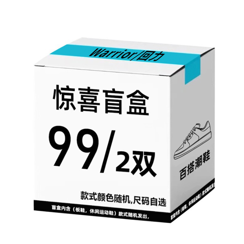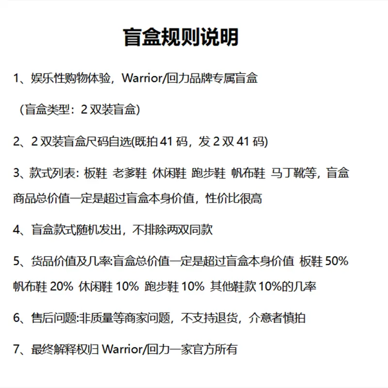 Правила слепых коробок:1. Развлекательный опыт покупок, эксклюзивные слепые коробки бренда Warrior/Huili (тип: набор из 2 пар обуви).2. Размер набора из 2 пар выбирается самостоятельно (например, при заказе 41 размера отправляются 2 пары 41 размера).3. Список моделей: кеды, dad shoes, повседневная обувь, беговые кроссовки, кеды на ткани, мартинсы и др. Общая стоимость товаров в слепой коробке гарантированно превышает её цену, предлагая высокое соотношение цены и качества.4. Модели в слепой коробке отправляются случайным образом, возможна отправка двух одинаковых пар.5. Стоимость товаров и вероятности: общая стоимость гарантированно выше цены коробки. Вероятности: кеды — 50%, кеды на ткани — 20%, повседневная обувь — 10%, беговые кроссовки — 10%, другие модели — 10%.6. Послепродажное обслуживание: возврат не принимается, кроме случаев брака или ошибок продавца. Осторожно тем, кто сомневается.7. Окончательное право толкования правил принадлежит официальному представительству Warrior/Huili.