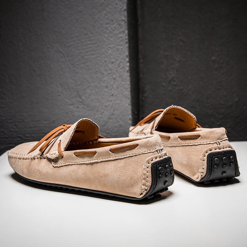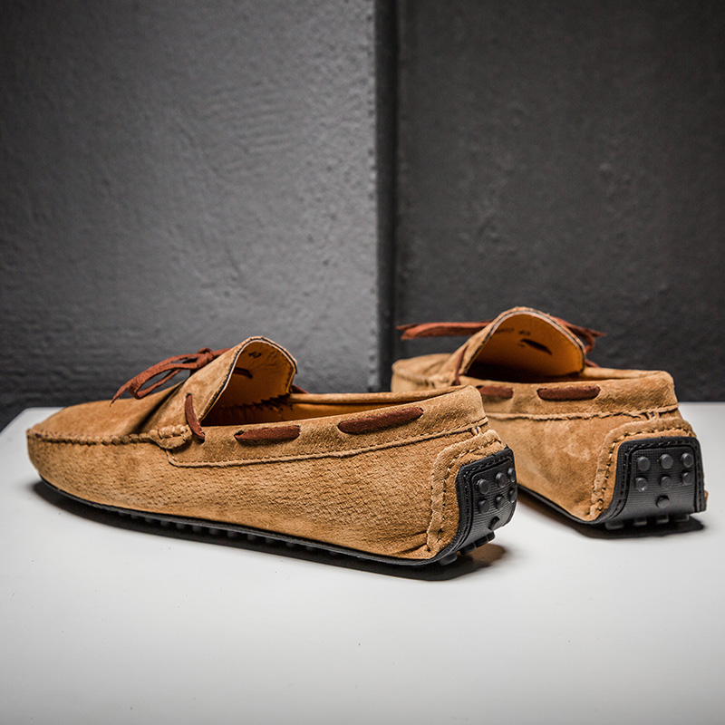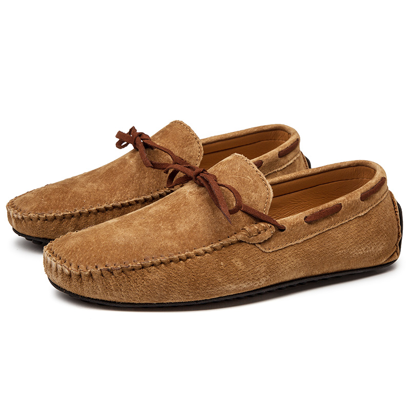 Это черные лоферы. Обувь выполнена в классическом дизайне мокасин, верхняя часть изготовлена из черной замши, мягкой на ощупь и с выразительной текстурой. На верхней части завязаны коричневые шнурки, что придает модели нотку ретро и непринужденности. Подошва сделана из черной резины, обладает хорошей износостойкостью и противоскользящими свойствами, подходит для повседневной носки. Общий дизайн обуви прост и элегантен, без излишних украшений, демонстрируя сдержанный и изысканный стиль. Лоферы обычно считаются универсальной моделью обуви: их можно сочетать с повседневной одеждой, а также в определенной степени адаптировать к более формальным нарядам, что делает их подходящими для различных случаев.