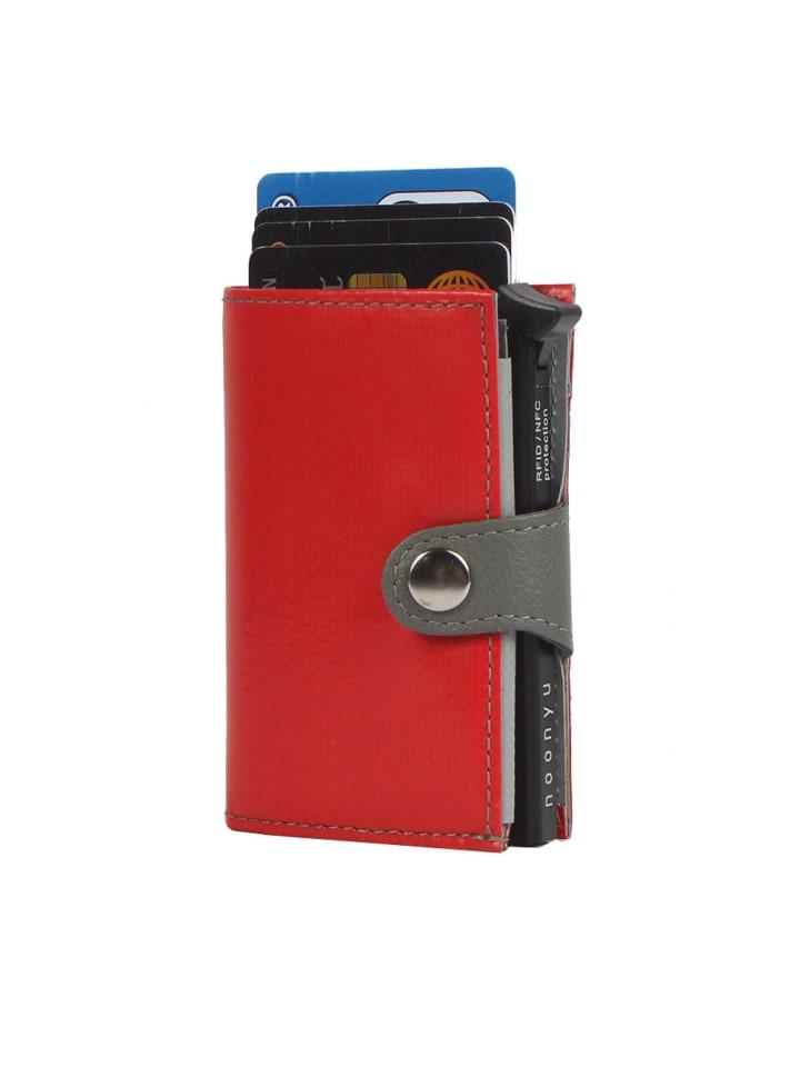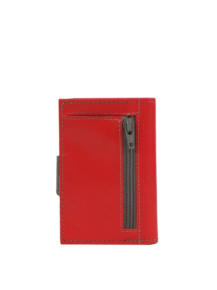 Мини-кошелек Noonyu Single Tarpaulin с выдвижным механизмом для кредитных карт от 7clouds изготовлен из переработанного брезента (использованного рекламного брезента). Внешняя застежка выполнена из кожи растительного дубления. Он также оснащен алюминиевым корпусом с функцией блокировки RFID/NFC и функцией выдвижения. Алюминиевый корпус вмещает до семи кредитных карт. В кошельке также есть отделение для монет и купюр. Все необходимое в компактном размере!