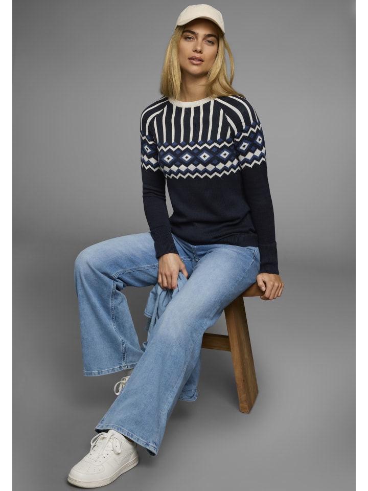 Классический женский жаккардовый свитер от AJC в норвежском стиле и скандинавском стиле. Облегающий крой, закрывающий бедра. Длинные рукава. Благодаря эластичной тонкой вязке, верх не сковывает движений и сохраняет тепло.