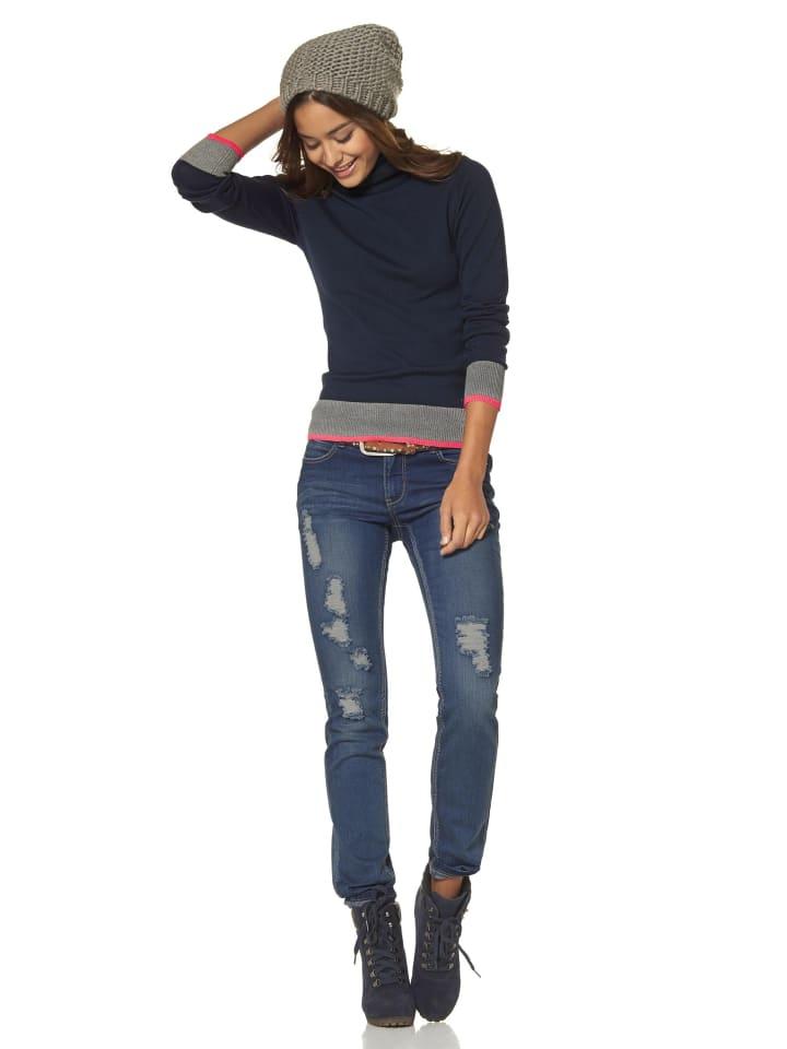 - Неоновые детали на темно-синем свитере с высоким воротом