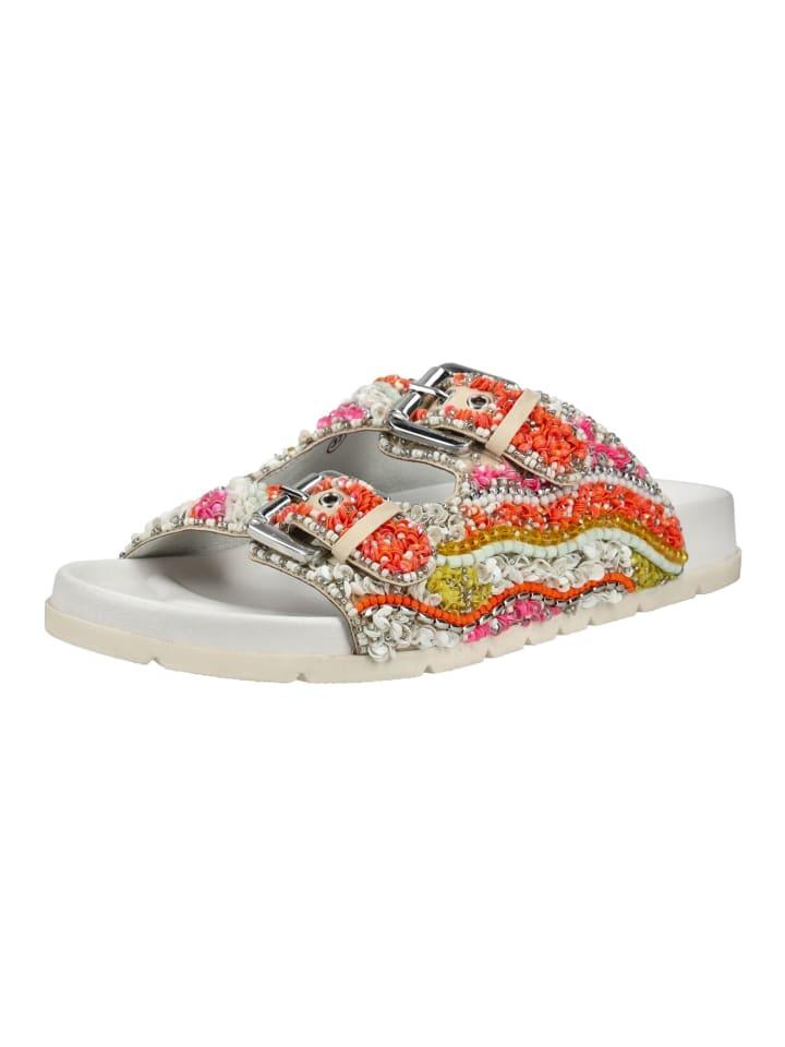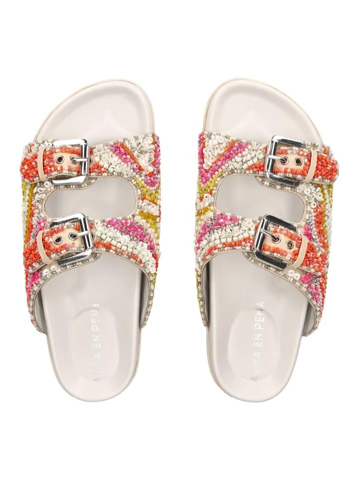 Элегантный силуэт и минималистичный дизайн делают эти мюли ALMA EN PENA настоящей must-have в любом гардеробе. Кожаный верх искусно украшен пайетками, жемчугом и стразами - идеальное сочетание с джинсами-бойфрендами и объемной блузкой для создания повседневно-шикарного городского образа.