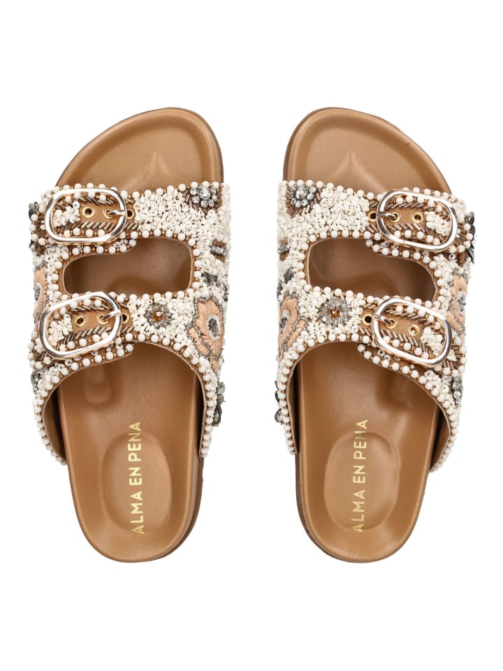 Элегантный силуэт и минималистичный дизайн делают эти мюли ALMA EN PENA настоящей must-have в любом гардеробе. Кожаный верх искусно украшен пайетками, жемчугом и стразами - идеальное сочетание с джинсами-бойфрендами и объемной блузкой для создания повседневно-шикарного городского образа.