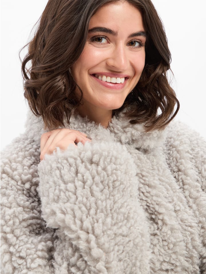 Плюшевая куртка-мех от Amber & June с широким кроем, отложным воротником и застежкой на кнопки станет отличным акцентом в стильных образах.