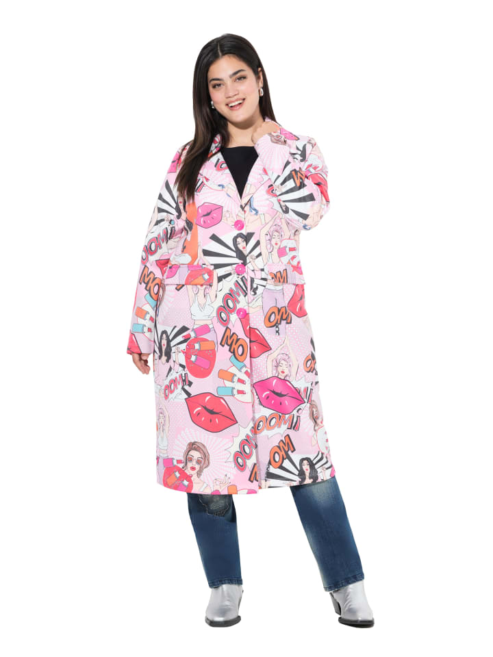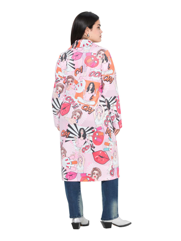 Длинный блейзер, удобного кроя, из приятной эластичной ткани с мягким велюровым принтом. Воротник с лацканами, застежка на пуговицы, длинные рукава и два кармана с клапанами.
