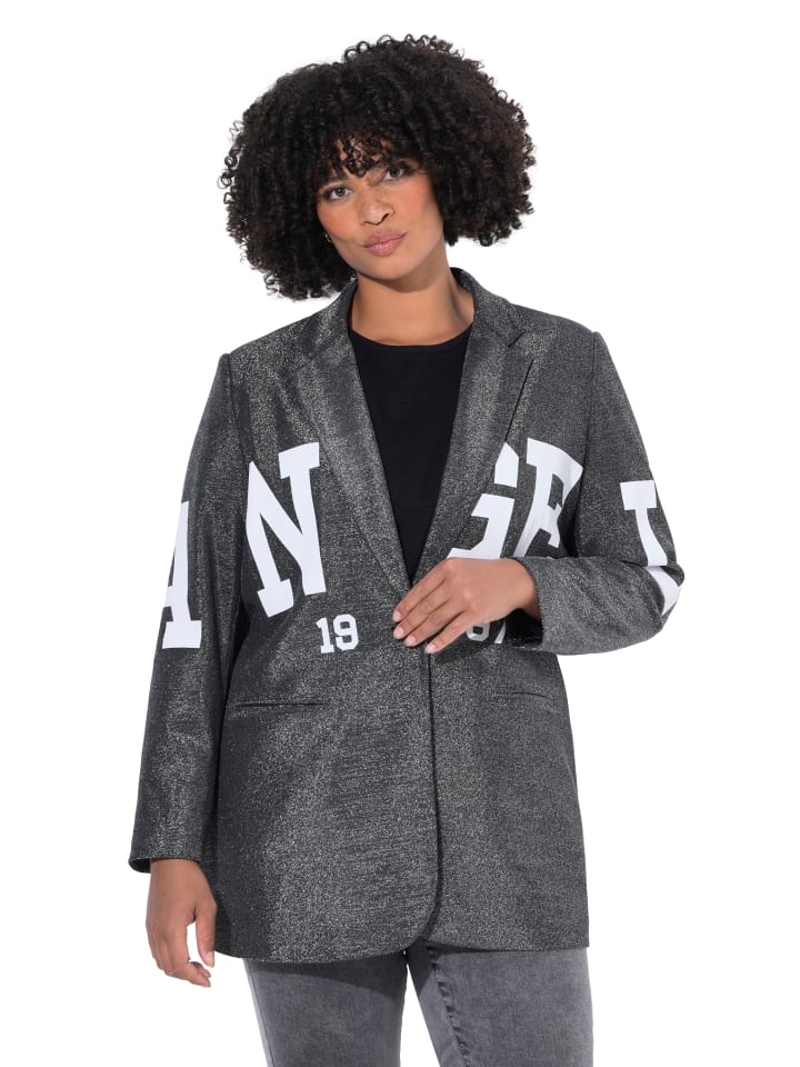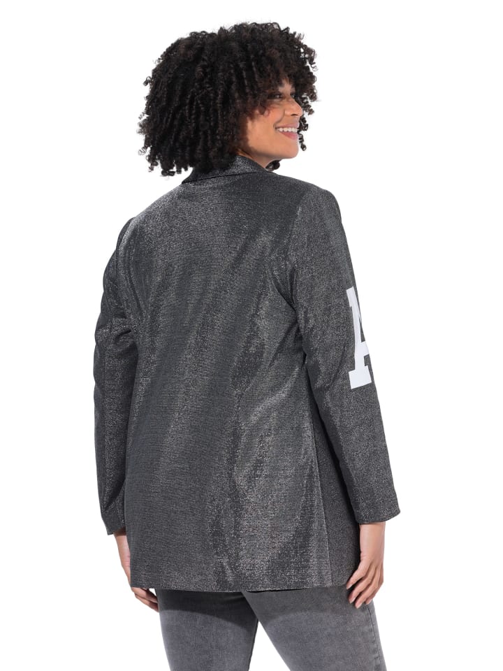 Блейзер прямого кроя с мелкими блестками и аппликацией в виде буквы XL. Воротник с лацканами, прорезные карманы, длинные рукава. Полностью на подкладке.