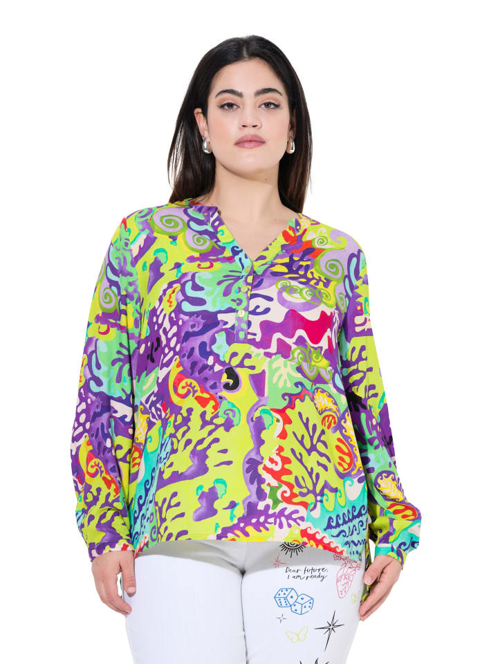 Блузка А-силуэта из мягкой вискозы с ярким коралловым принтом. Туникообразный вырез с планкой на пуговицах, длинные рукава с манжетами. Удлиненный подол сзади.