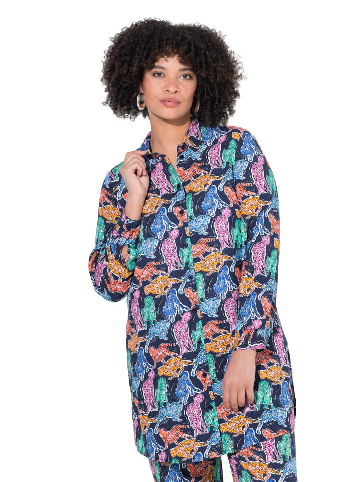 Блузка прямого кроя из мягкой вискозы с ярким тигровым принтом. Отложной воротник, длинные рукава с манжетами и боковыми разрезами.