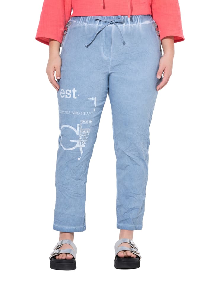 Удобные спортивные брюки из мягкой вискозной ткани с жатым эффектом и модной фактурой. Особенности: принт спереди. Эластичный пояс с завязкой. 2 кармана на молнии, 2 кармана сзади.
