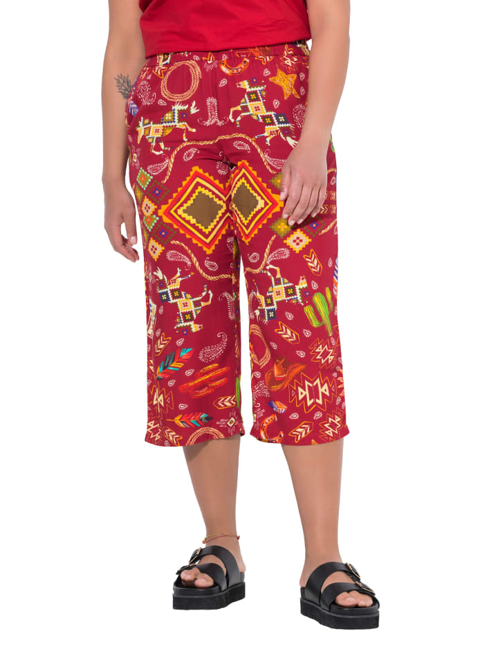 Брюки свободного кроя, прямого кроя, из мягкой вискозы с рисунком в стиле вестерн. Эластичный пояс, боковые карманы.