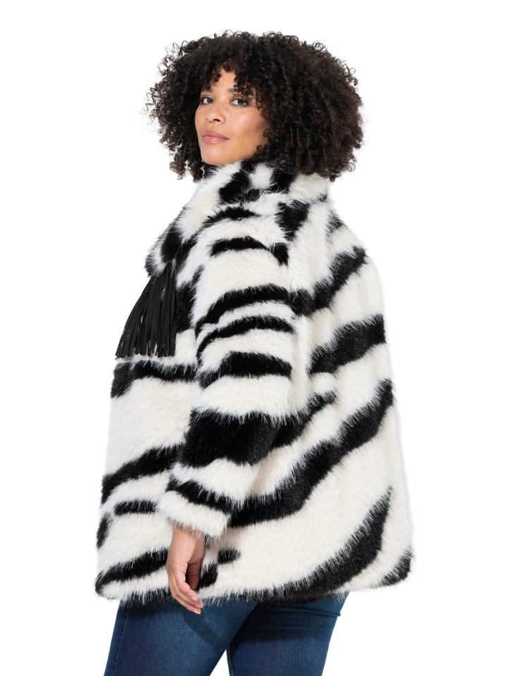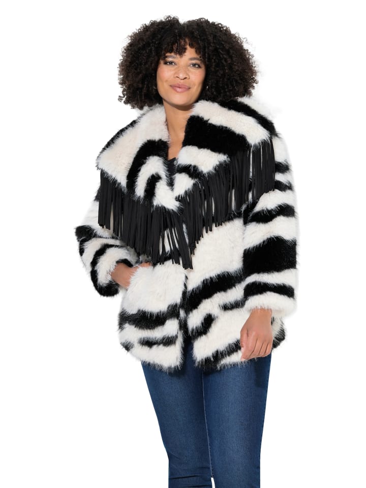 Плюшевая куртка прямого кроя из приятного узорчатого плюша. Воротник с лацканами и бахромой, застежка на пуговицы, 2 кармана. Длинные рукава, полностью на подкладке.