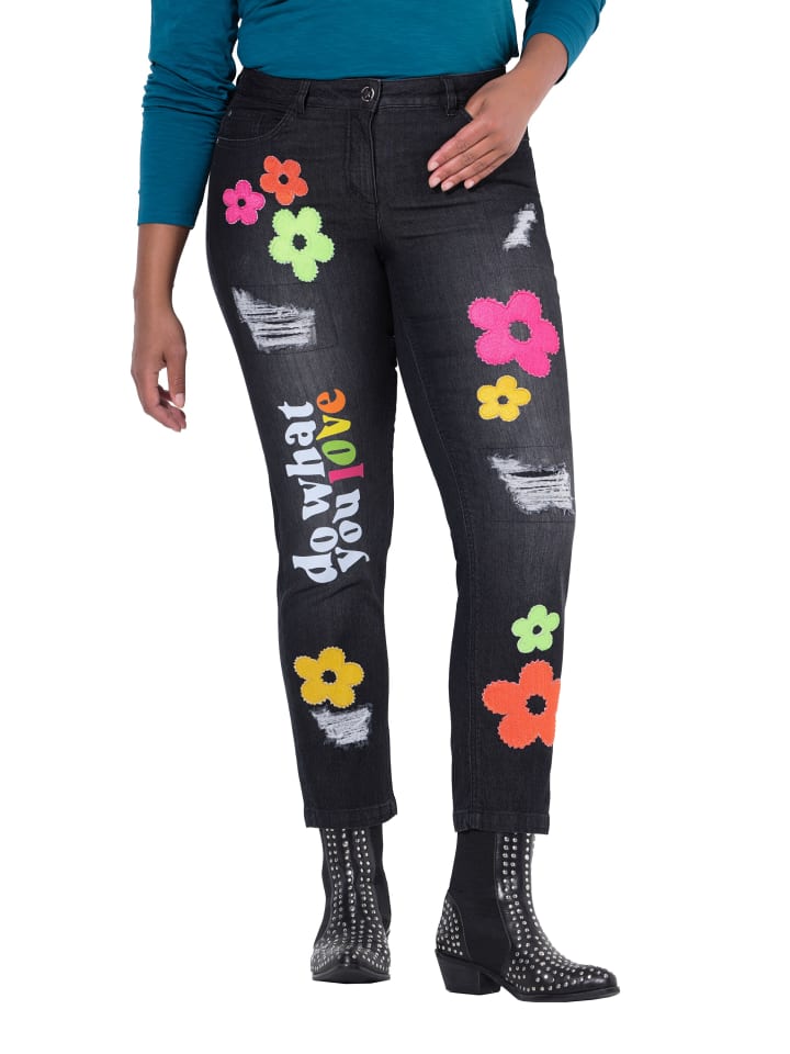 Джинсы прямого кроя длиной 7/8 из эластичного денима с цветными нашивками и слегка потертыми деталями. Модель с пятью карманами, пояс со шлевками для ремня, застежкой на пуговицу и молнию.