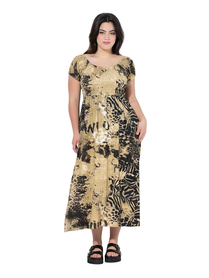 Платье макси из джерси, А-силуэта, выполнено из мягкого вискозного трикотажа с леопардовым принтом. Вырез горловины - лодочка, бюст - сборка на резинке, рукава реглан - половина длины.