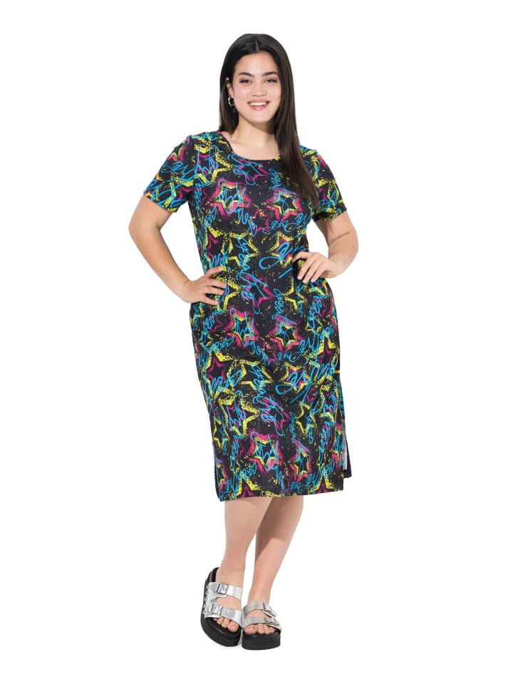 Платье макси из трикотажного полотна прямого кроя из комфортного эластичного трикотажа со звездным узором. Круглый вырез, короткие рукава и разрезы по бокам.