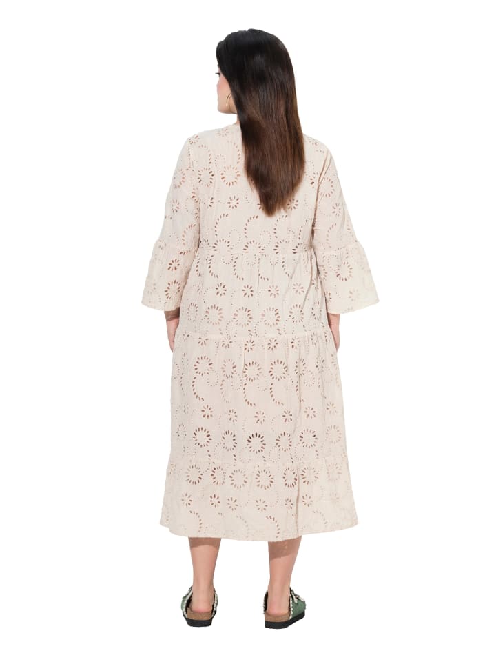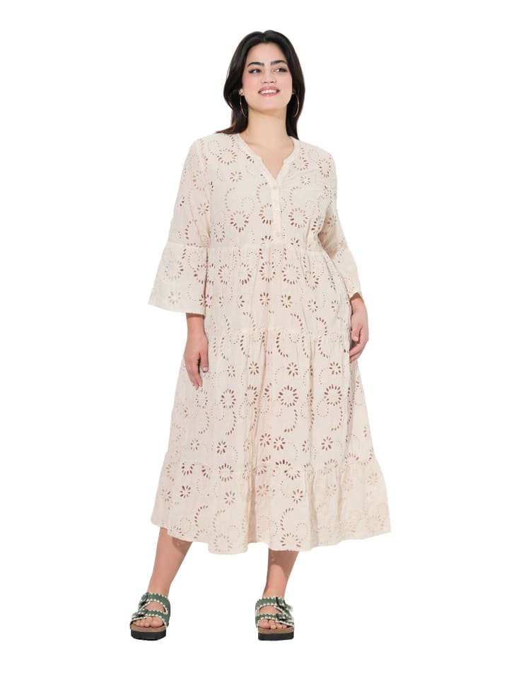 Платье миди А-силуэта из мягкого хлопка с шитьем англез, швом ампир и воланами. Туникообразный вырез с планкой на пуговицах, рукава длиной 3/4 с воланами. Внешний материал: 100% хлопок.