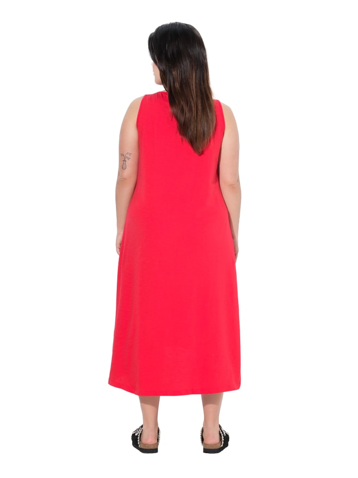 Платье миди из джерси, без рукавов, с круглым вырезом. Скругленный подол, удлиненный сзади.