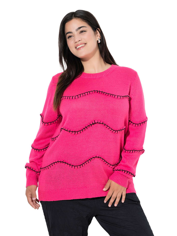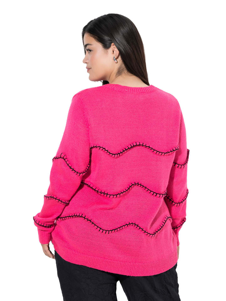 Свитер прямого кроя из мягкой тонкой пряжи с волнистым узором. Круглый вырез, длинные рукава и манжеты в рубчик.