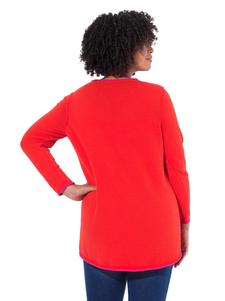 Джемпер прямого кроя из тонкой пряжи неонового цвета с эффектным рисунком и цветными подвернутыми краями. Круглый вырез, длинные рукава. Закругленный подол, удлиненный сзади. Внешний материал: 100% полиэстер.