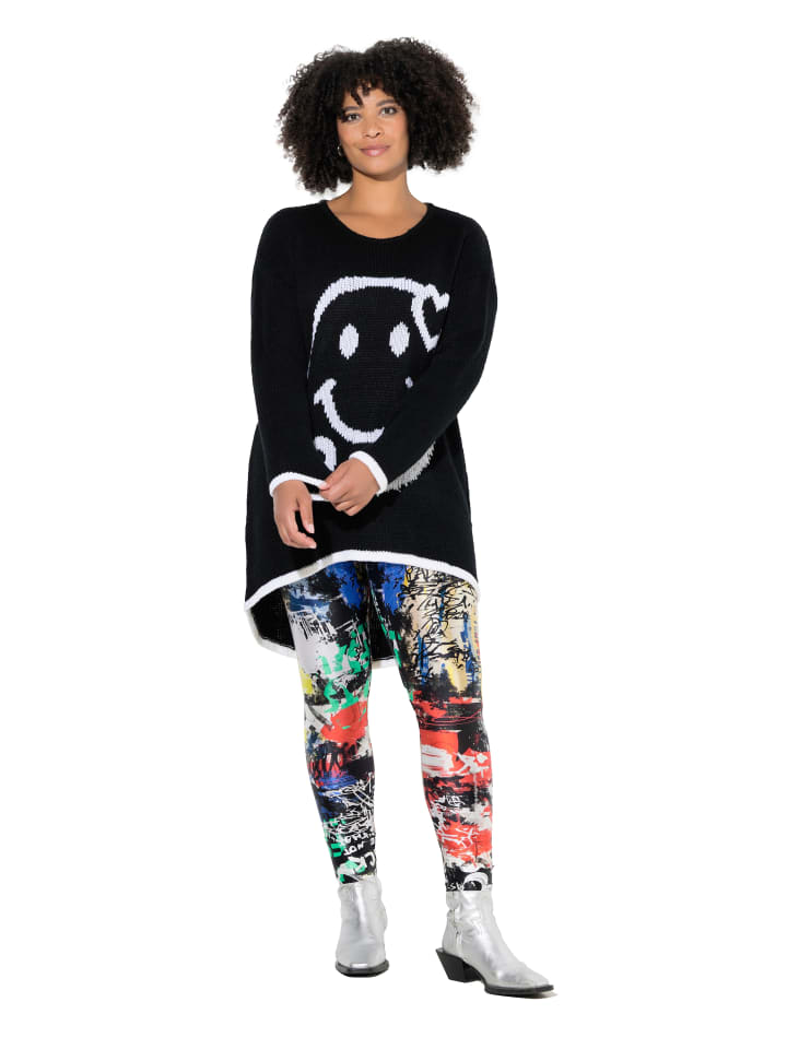 Джемпер А-силуэта из мягкой крупной вязки с изображением большого смайлика. Круглый вырез горловины, спущенная линия плеча, длинные рукава. Низ с цветной отделкой, удлиненная спинка.