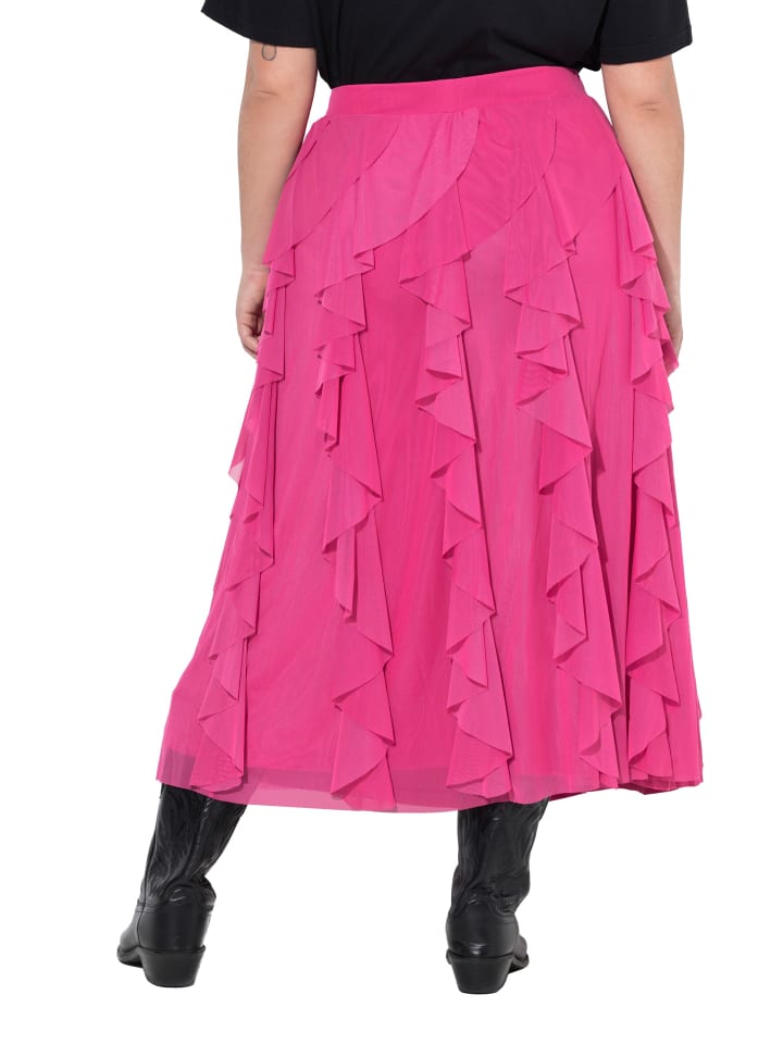 Юбка А-силуэта из сетки в современном стиле с сетчатыми оборками. Эластичный пояс и плотная трикотажная подкладка. Внешний материал: 100% полиэстер. Подкладка: 100% полиэстер.