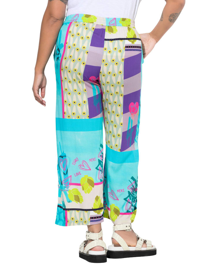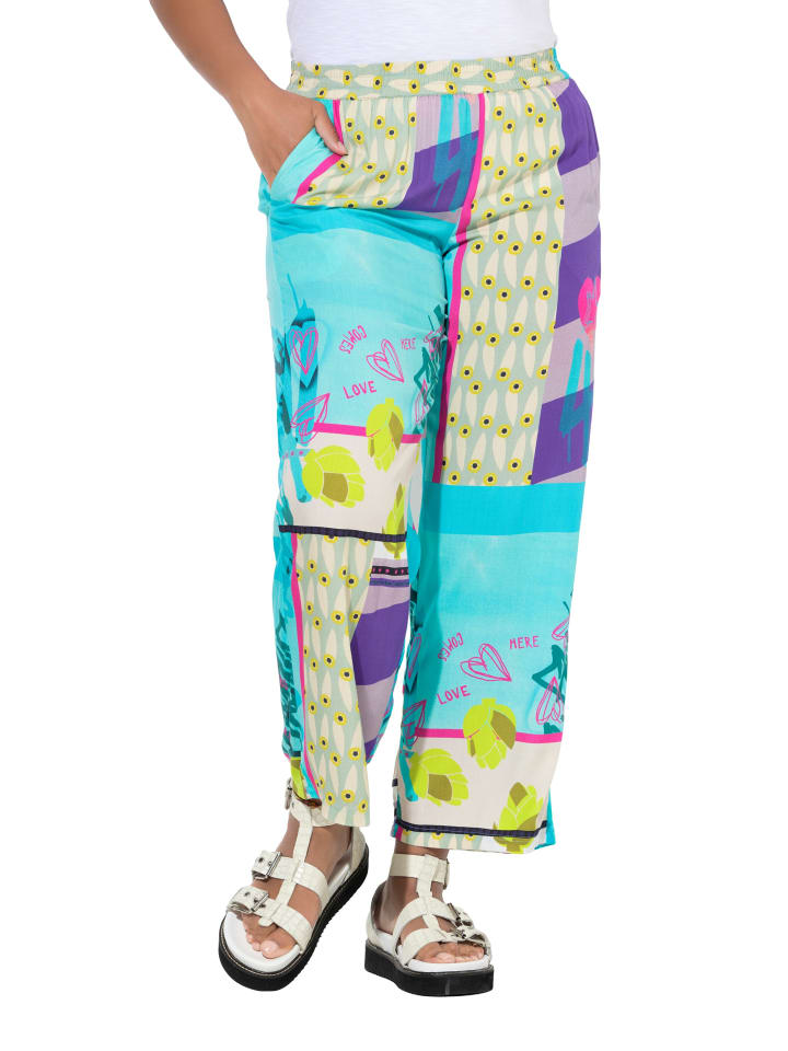 Брюки прямого кроя из мягкой, струящейся вискозы с ярким принтом по всей поверхности. Эластичный пояс с боковыми карманами.