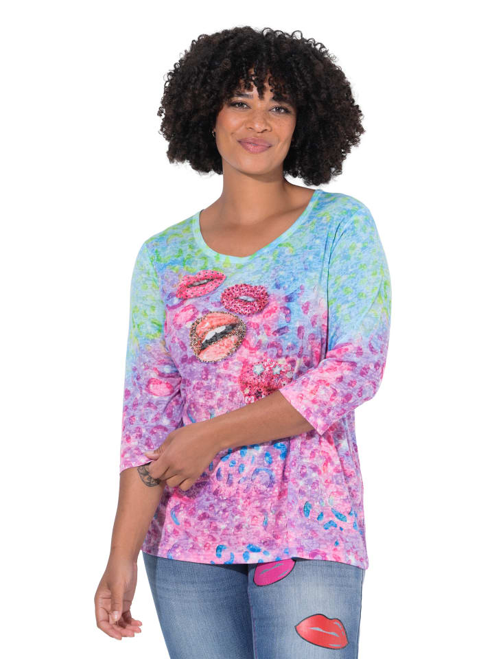 Футболка комфортного кроя из мягкого трикотажа с принтом радужного леопарда и блестящими стразами на поцелуе. V-образный вырез, рукава 3/4. Состав: 80% полиэстер, 20% вискоза.