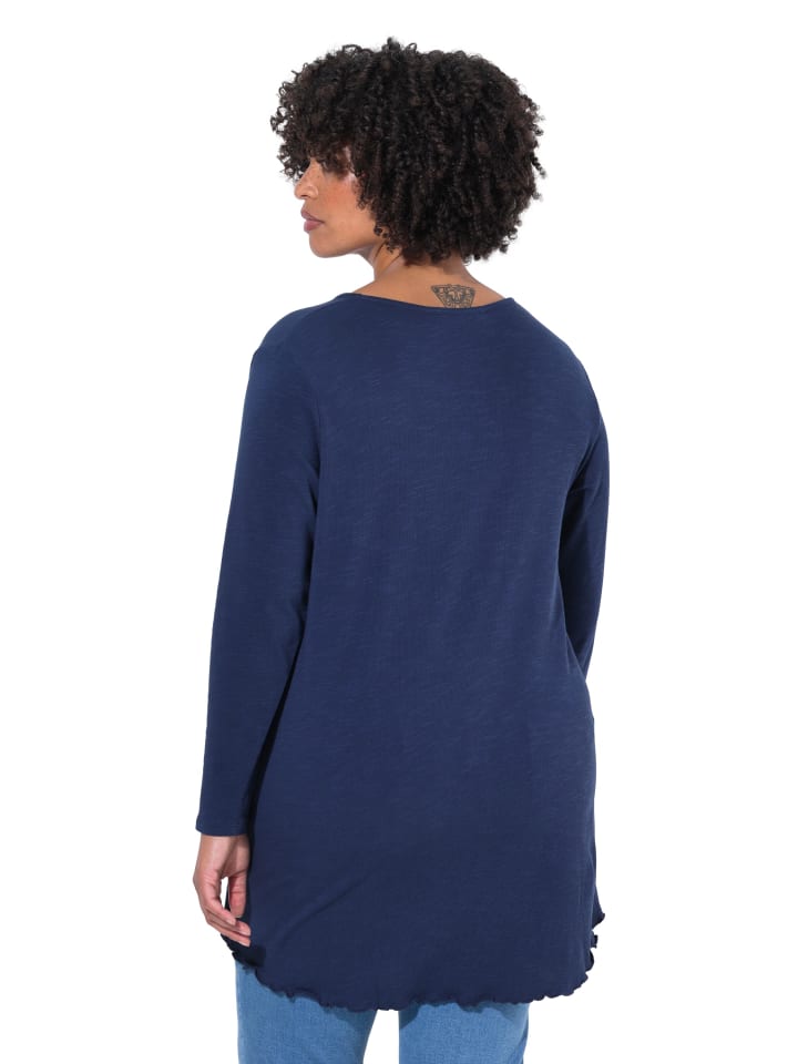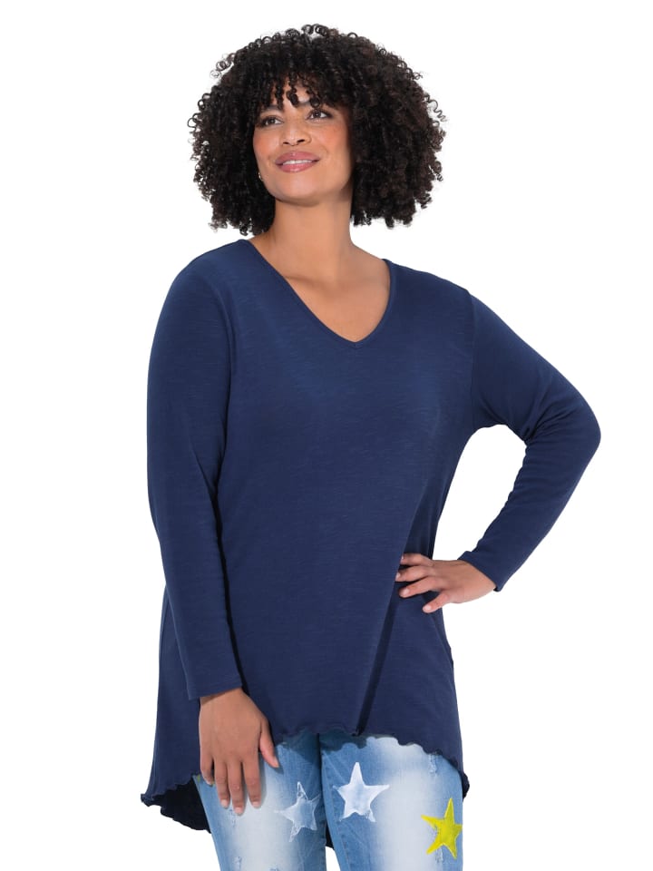 Трикотажная рубашка А-силуэта из мягкой тонкой пряжи. V-образный вырез, длинные рукава, удлиненный подол сзади.
