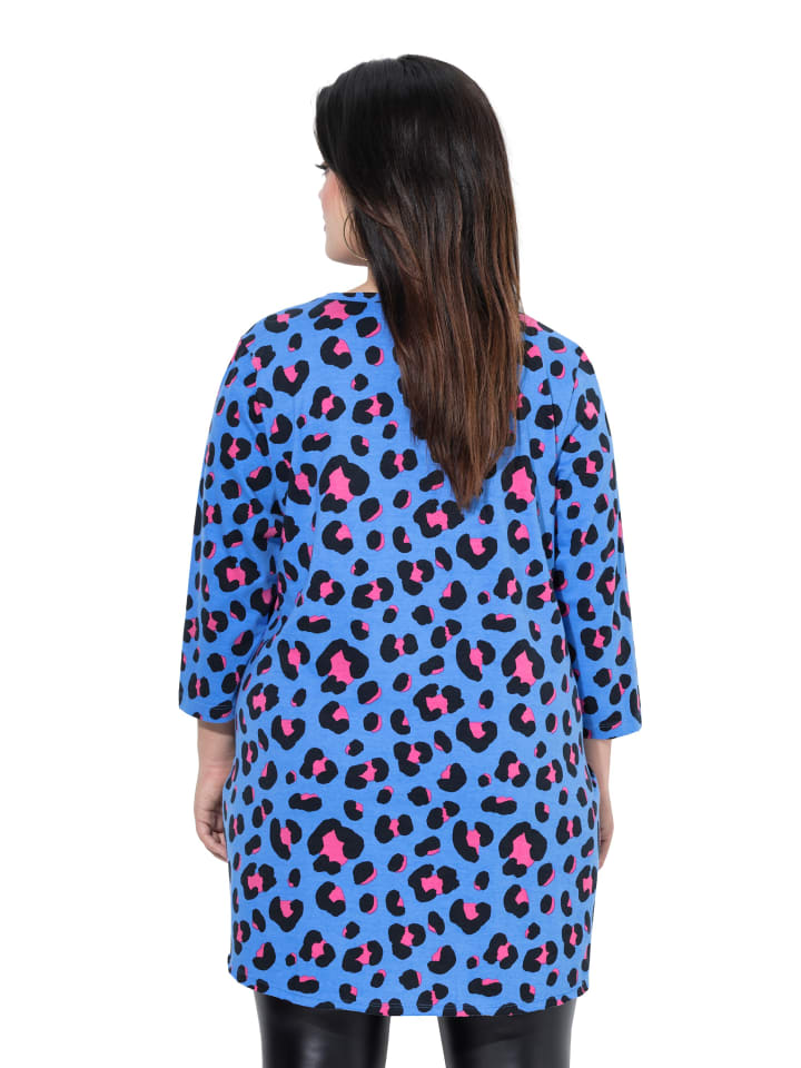 Футболка А-силуэта из мягкого трикотажа с ярким леопардовым принтом и необработанными краями. V-образный вырез, рукава 3/4, закругленный нижний край, удлиненная спинка.