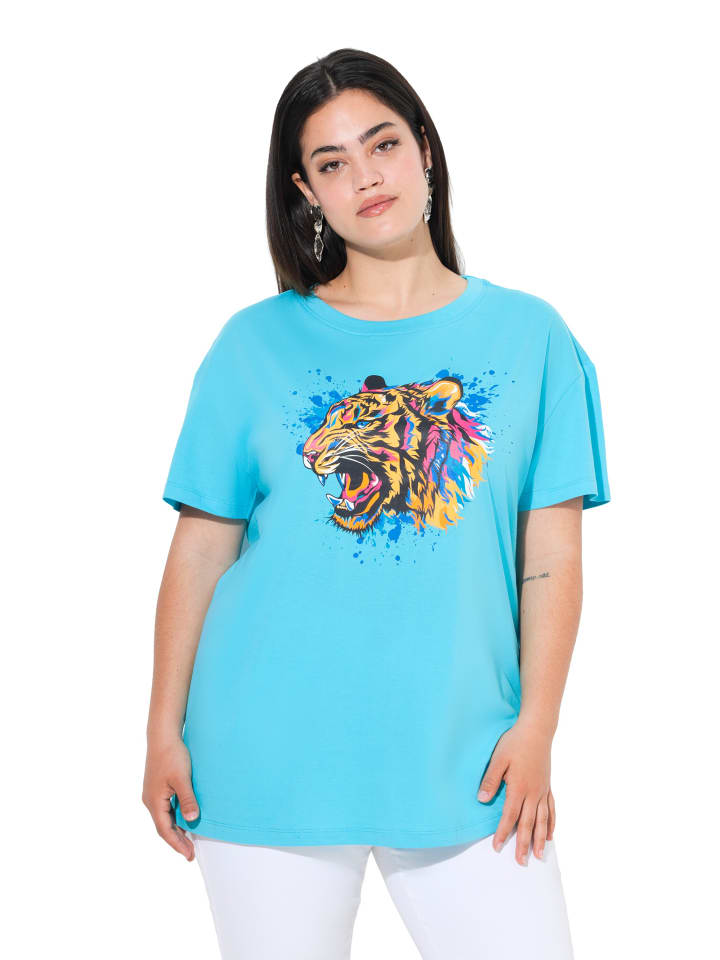 Футболка свободного кроя из мягкого трикотажа с красочным изображением головы тигра. Круглый вырез, спущенная линия плеча и короткие рукава.