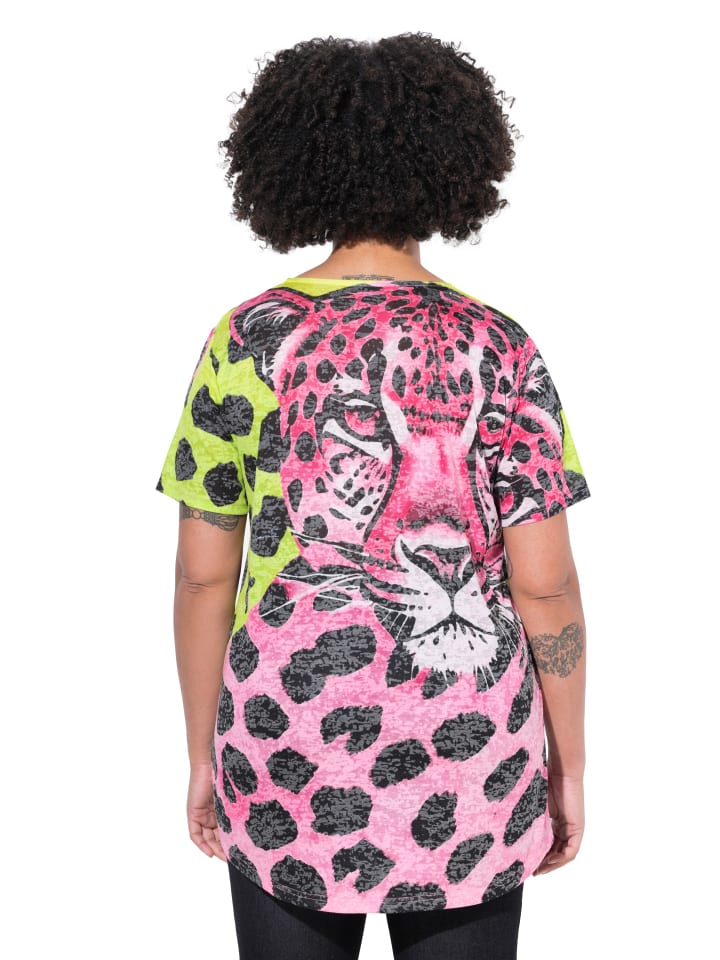 Футболка А-силуэта из мягкого трикотажа с эффектом выжигания, украшенная блестящими камнями на леопардовой нашивке. V-образный вырез, короткие рукава. Удлиненный подол сзади.