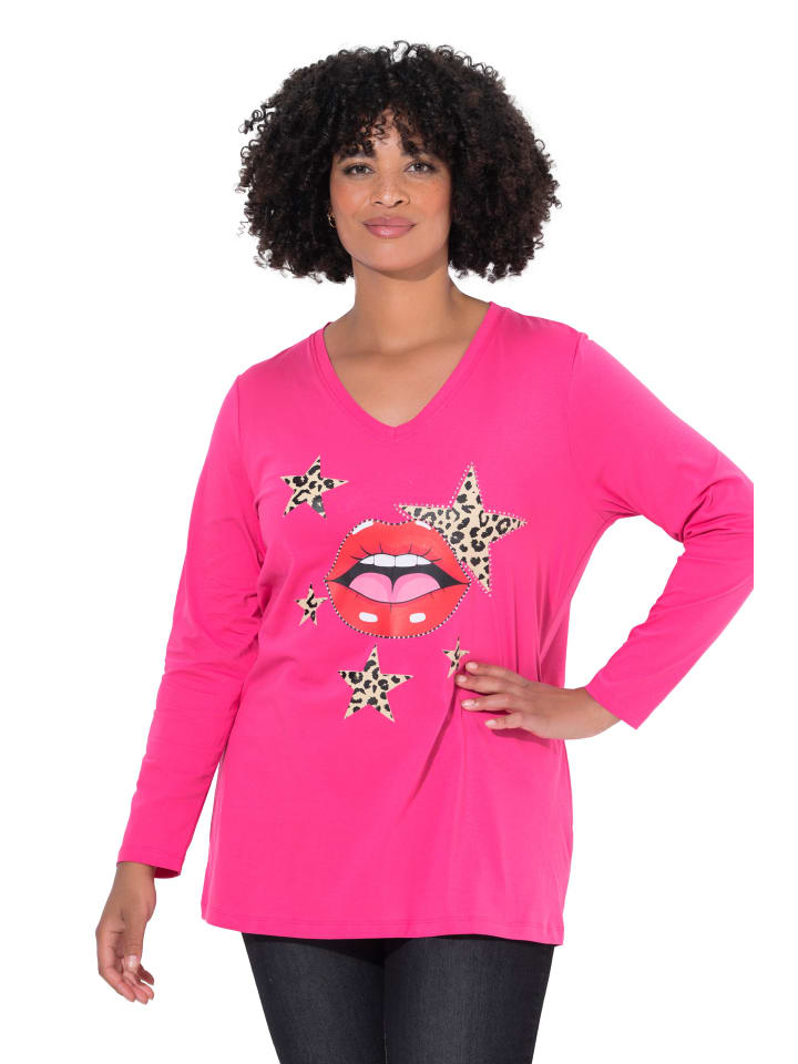 Футболка комфортного кроя из мягкого трикотажа с блестящими камнями на мотиве поцелуй-рот. V-образный вырез, длинные рукава.