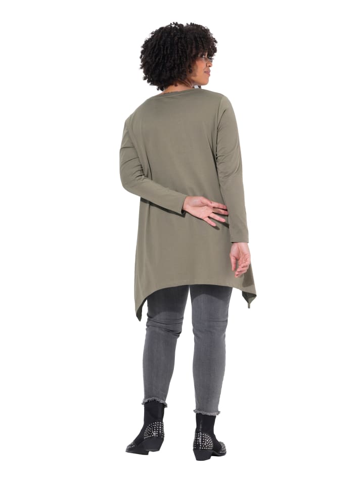 Футболка А-силуэта из мягкого трикотажа с надписью рок-н-ролл. Круглый вырез, длинные рукава и заостренный подол.
