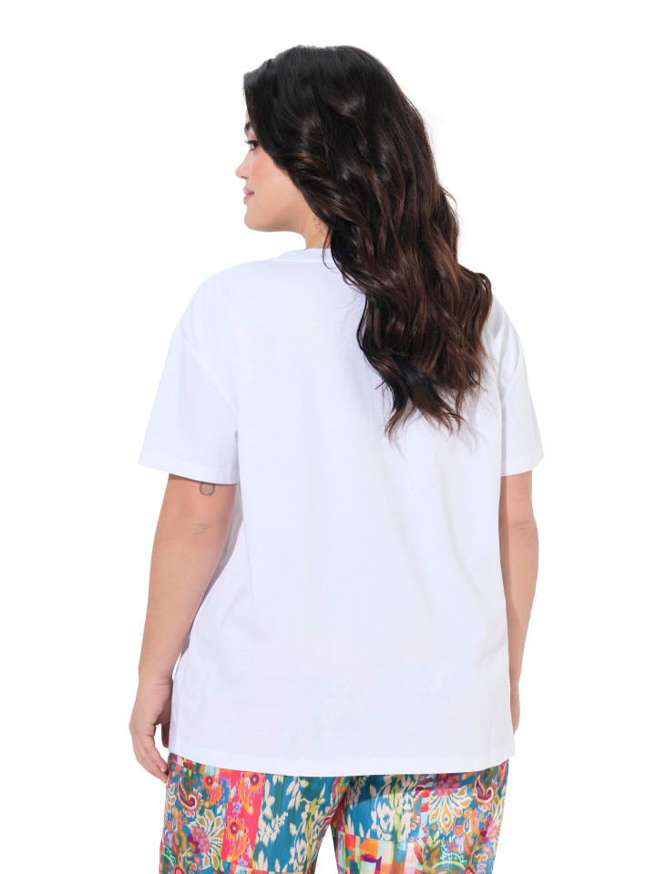 Футболка свободного кроя из мягкого трикотажа с модной бахромой спереди. Круглый вырез, спущенная линия плеча и короткие рукава.