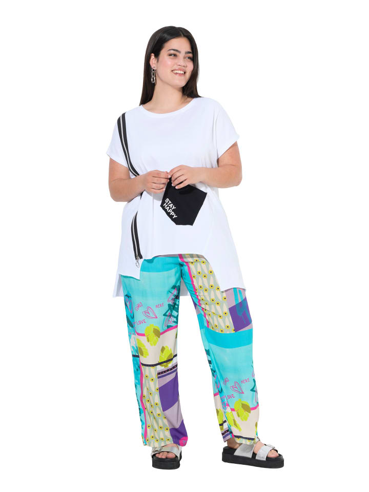 Футболка свободного кроя из мягкого трикотажа с декоративной молнией и накладным карманом. Круглый вырез, спущенная линия плеча, широкие рукава летучая мышь и необработанный край.