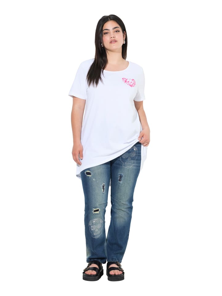 Футболка А-силуэта из мягкого трикотажа с крупным эффектным принтом на спине. Круглый вырез, принт с маленьким плюшевым мишкой спереди и короткие рукава. Внешний материал: 100% хлопок.