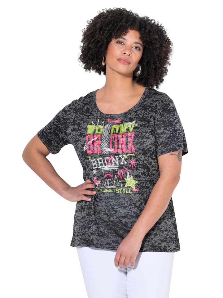 Футболка удобного кроя из мягкого выжженного трикотажа с надписью BRONX, украшенной блестящими камнями. Круглый вырез, короткие рукава.